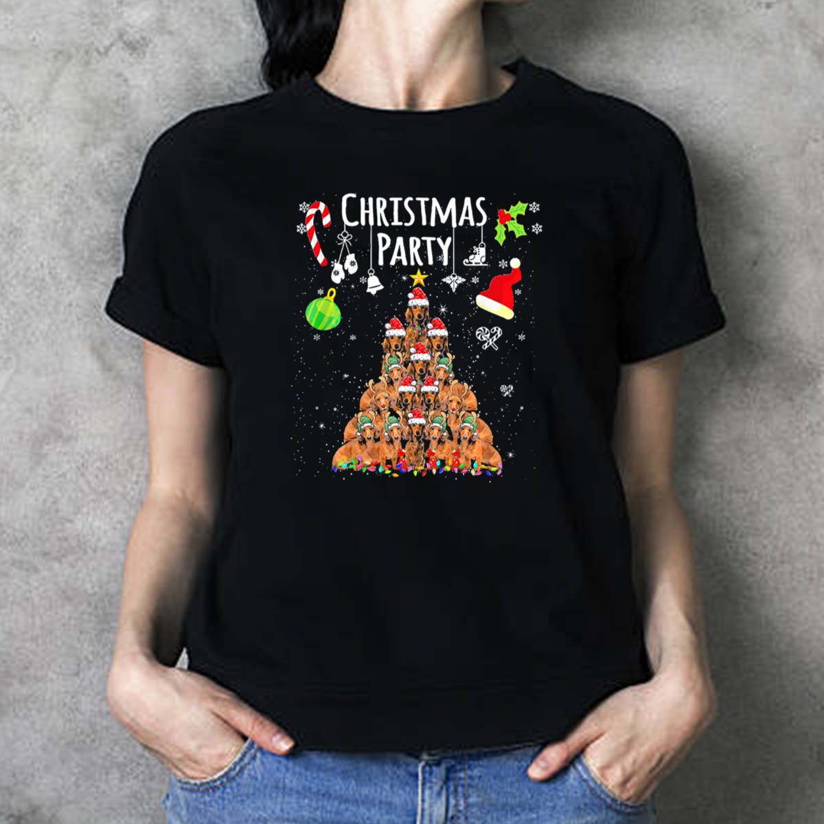 Dachshund Tree Christmas Party With Santa Hats And T-Shirt