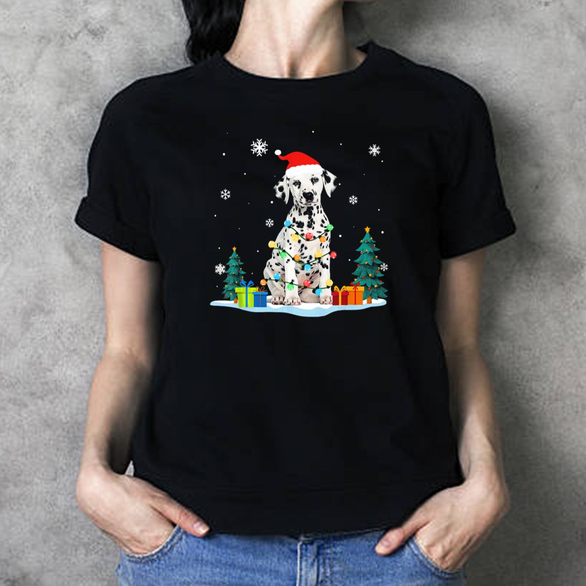 Dalmatian Wrapped In Christmas Lights With Santa Hat And Presents Surrounding Snowy Christmas Trees T Shirt