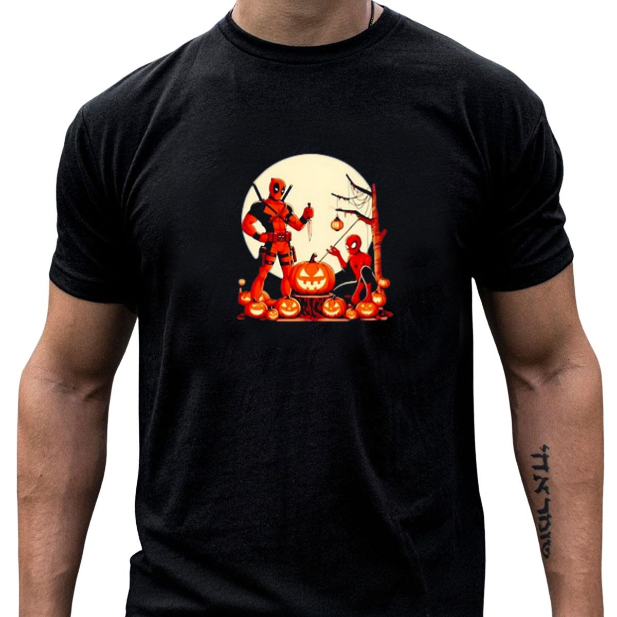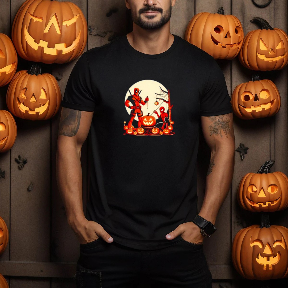 Get ready to celebrate Halloween in style with our Deadpool And Spiderman Retro Halloween Pumpkins Moon Scene T-Shirt! This fan-made design captures the playful essence of your favorite superheroes amidst a spooky backdrop, making it perfect for comic book lovers and Halloween enthusiasts alike. Whether you’re heading to a costume party, a themed event, or just looking to add a unique touch to your daily wear, this shirt is a must-have for any casual occasion.