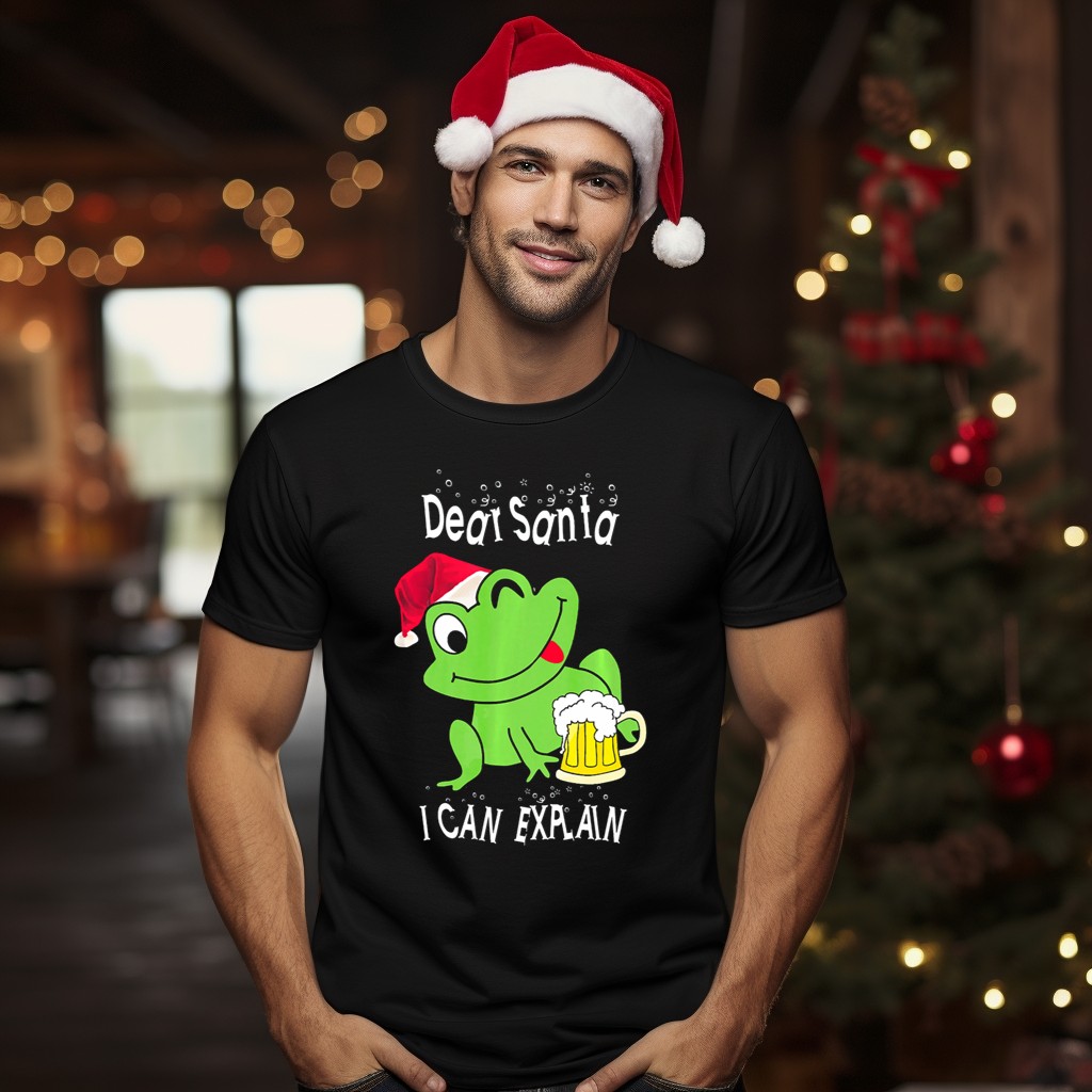 Get ready to spread some holiday cheer with our “Dear Santa I Can Explain” Christmas Festive Tipsy Santa Frog T-Shirt! Perfect for those who love to add a quirky twist to their holiday wardrobe, this shirt is ideal for casual wear, themed events, or just lounging around during the festive season. Its unique fan-made design showcases a playful Santa frog, making it a delightful conversation starter at any gathering!