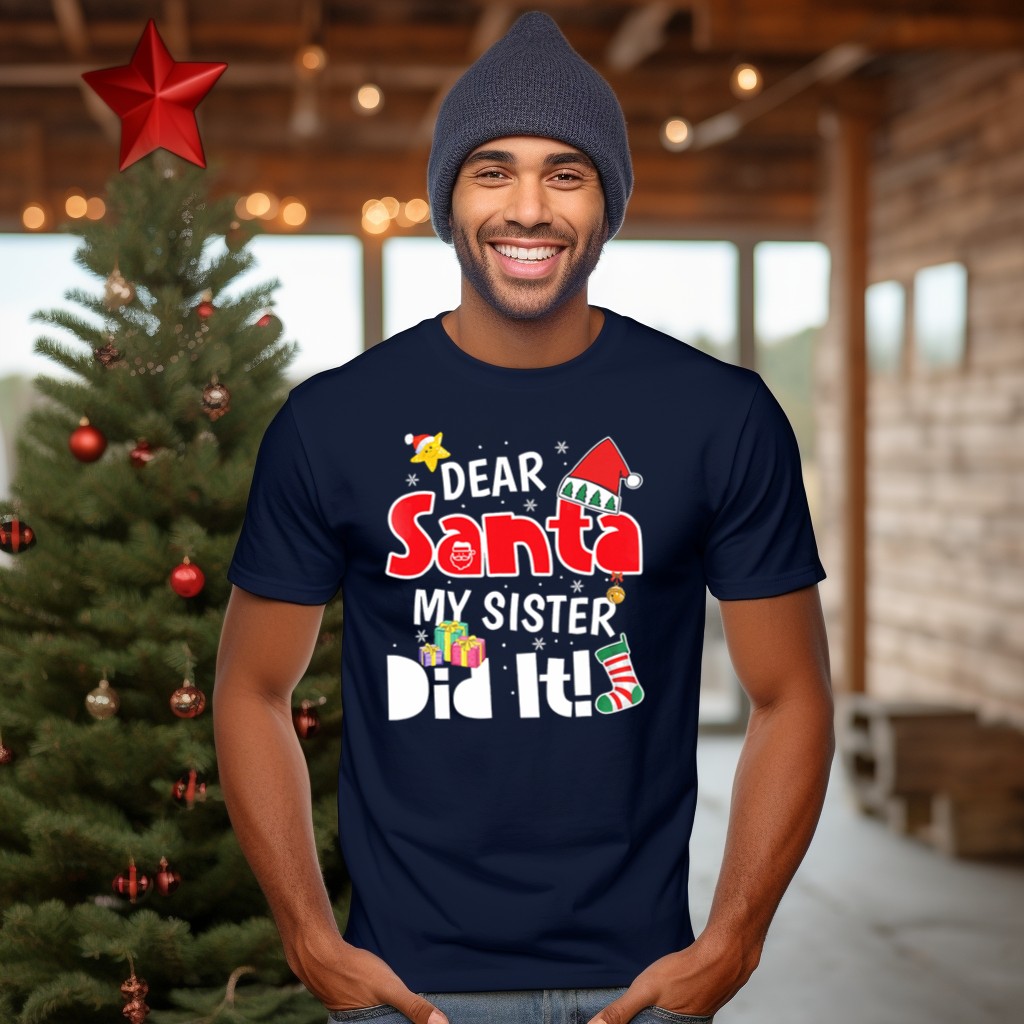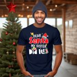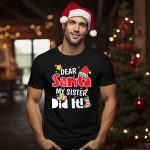 Spread the holiday cheer with our “Dear Santa My Sister Did It” T-shirt, perfect for those who love to share a laugh during the festive season! This fan-made design, printed in the USA, captures the playful spirit of Christmas, making it an ideal choice for family gatherings, themed events, or casual outings. Crafted for comfort and style, this shirt is a delightful addition to your holiday wardrobe or a great gift for your sister who has a mischievous side!