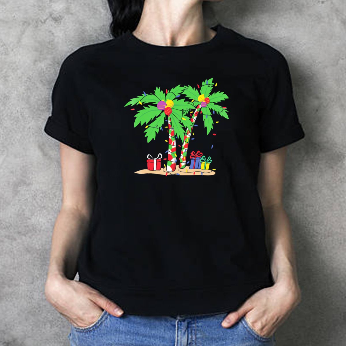 Be the first to review “Decorated Christmas Palm Tree With Holiday Lights And Gifts T Shirt”