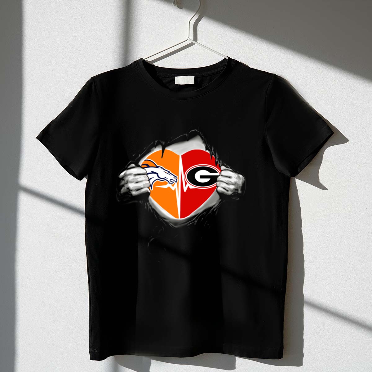 Show off your team spirit with this Denver Broncos Georgia Bulldogs Heart Logos T-Shirt, perfect for fans who love to represent their favorite teams in style. Crafted for comfort and durability, this shirt is ideal for casual wear, themed events, or simply lounging around. Its unique fan-made design, proudly printed in the USA, merges the passion of both teams, making it a must-have for any dedicated supporter.