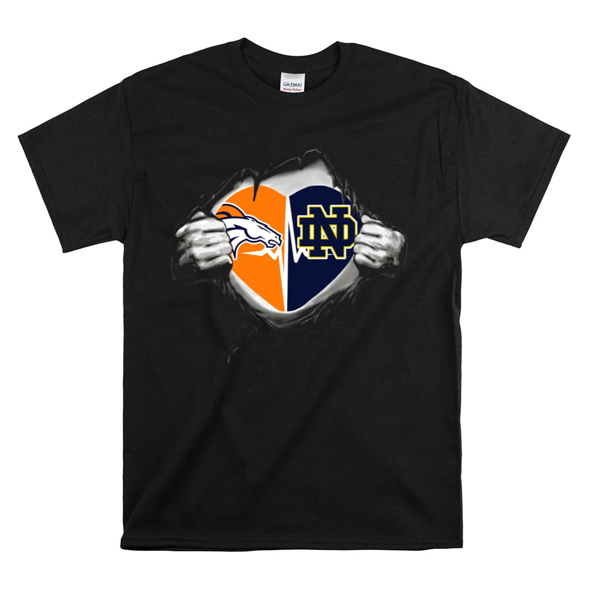 Show your passion for both the Denver Broncos and the Notre Dame Fighting Irish with our Heart Rip T-Shirt! This fan-made design is perfect for sports enthusiasts who want to express their love for both teams in a stylish way. Ideal for casual wear, themed events, or daily outings, this tee combines comfort with a bold statement that makes it stand out. Proudly printed in the USA, it’s a must-have for anyone looking to showcase their team spirit!