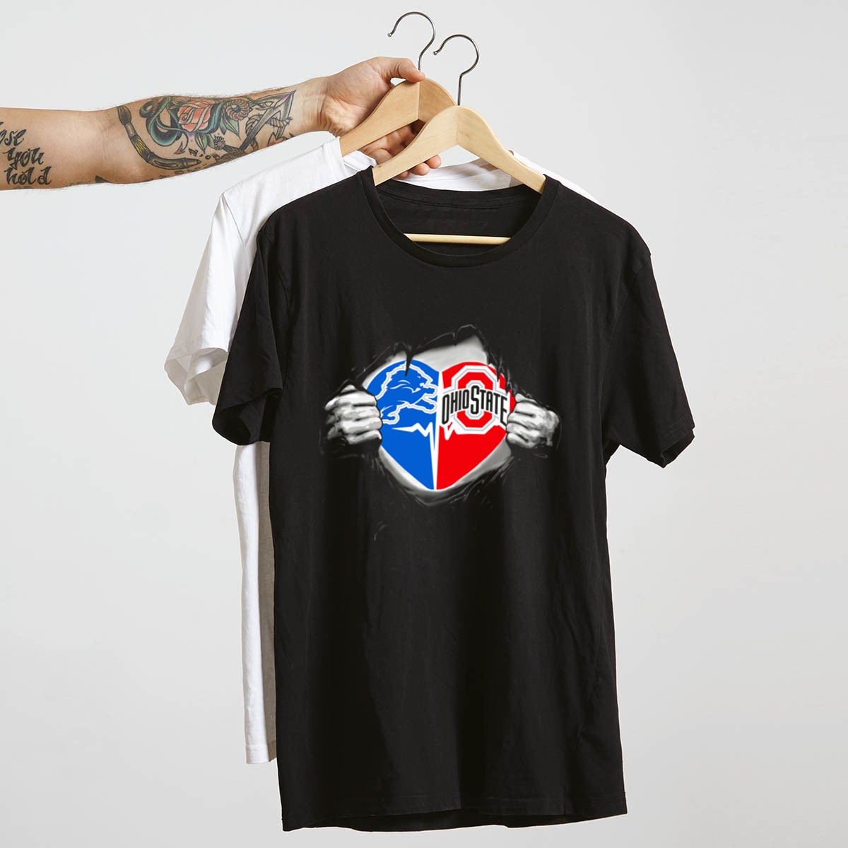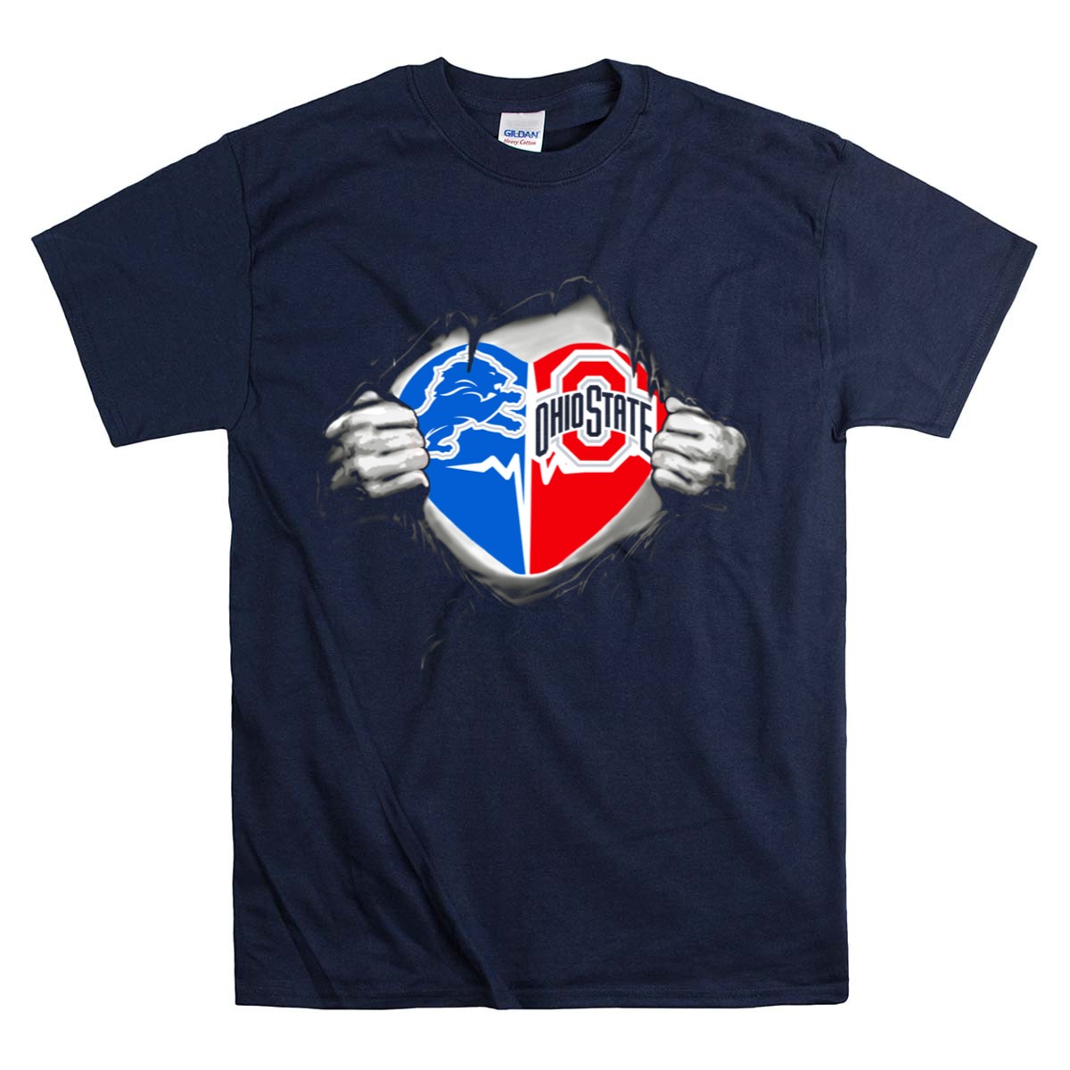 Show your love for both the Detroit Lions and Ohio State Buckeyes with this unique fan-made T-shirt, featuring a striking heart symbol with a rip effect. Perfect for sports enthusiasts and proud alumni, this shirt is ideal for casual outings, themed events, or just lounging around on game day. Made in the USA, it combines a stylish design with comfort, making it a must-have for any dedicated fan.