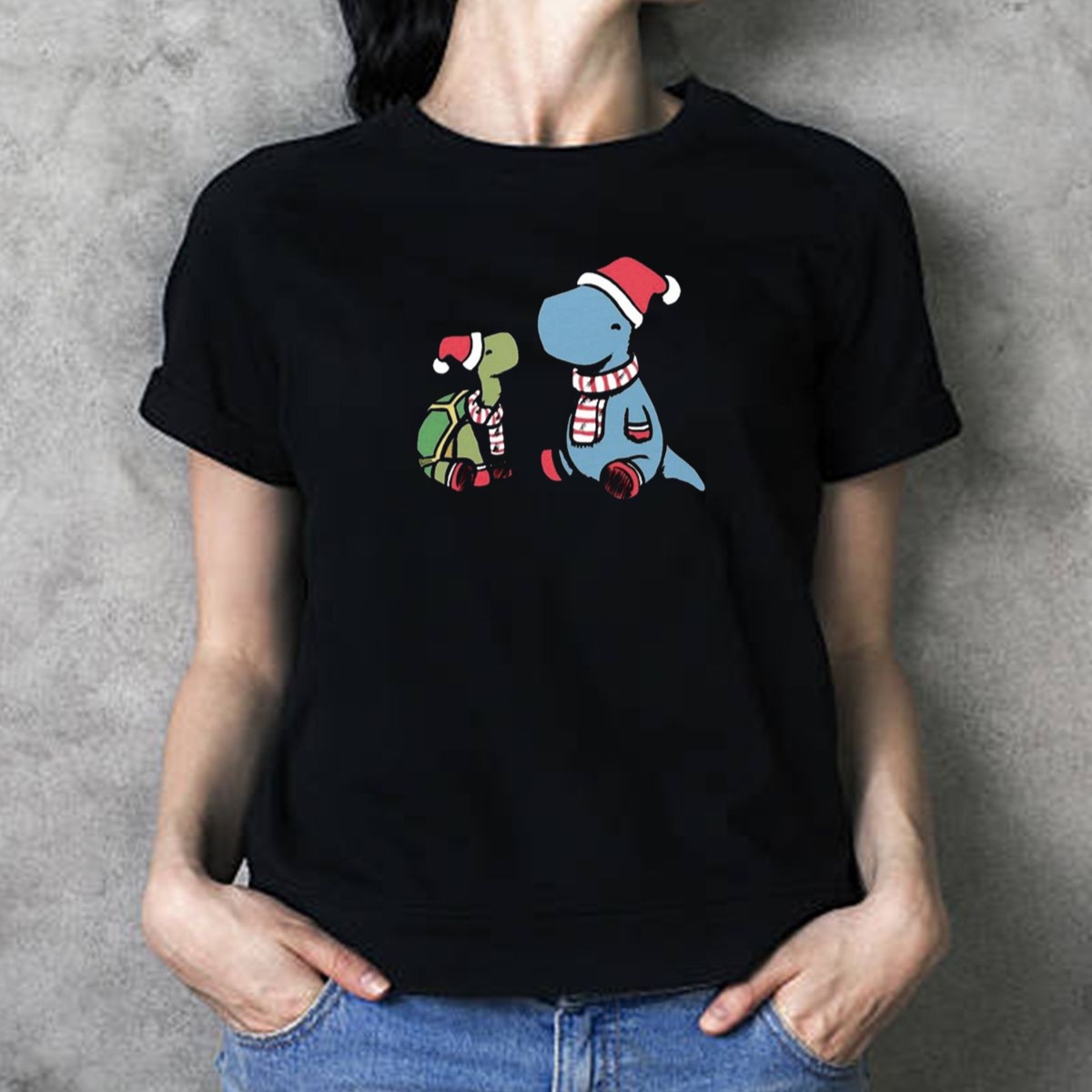 Celebrate the holiday season with a fun twist on classic Christmas themes with our Dinosaur Christmas Tortoise and Dino in Santa Hats and Scarves T-Shirt! Perfect for dino lovers and those looking to spread holiday cheer, this whimsical design adds a playful touch to any casual outfit. Ideal for themed events, family gatherings, or just lounging around during the festive season, this shirt is a must-have for anyone wanting to showcase their love for dinosaurs and Christmas spirit.