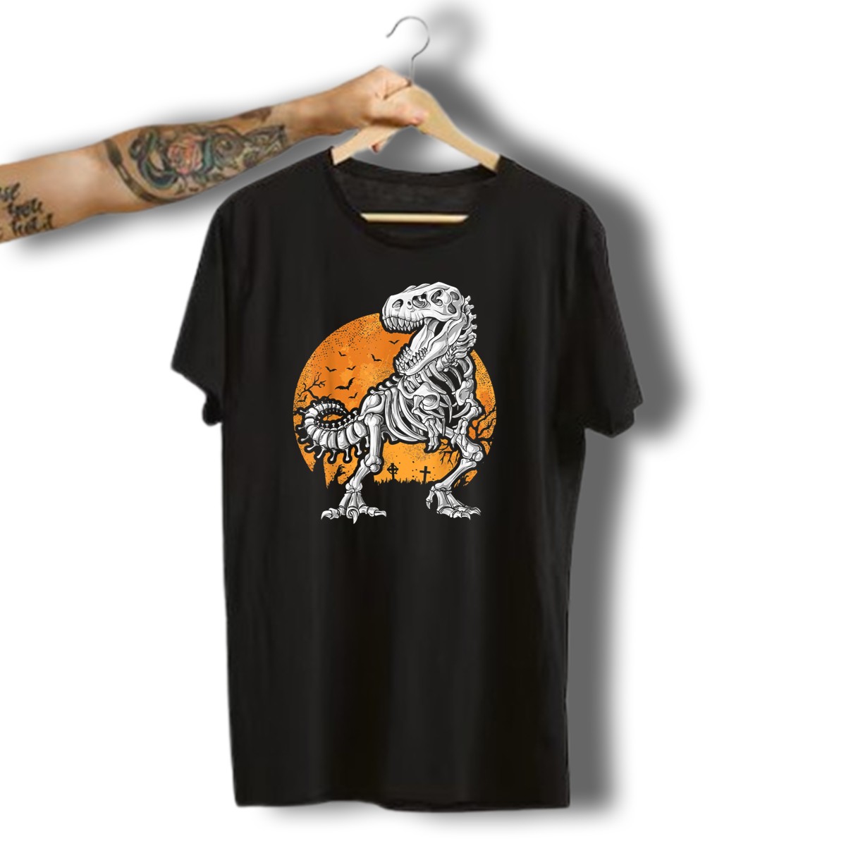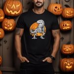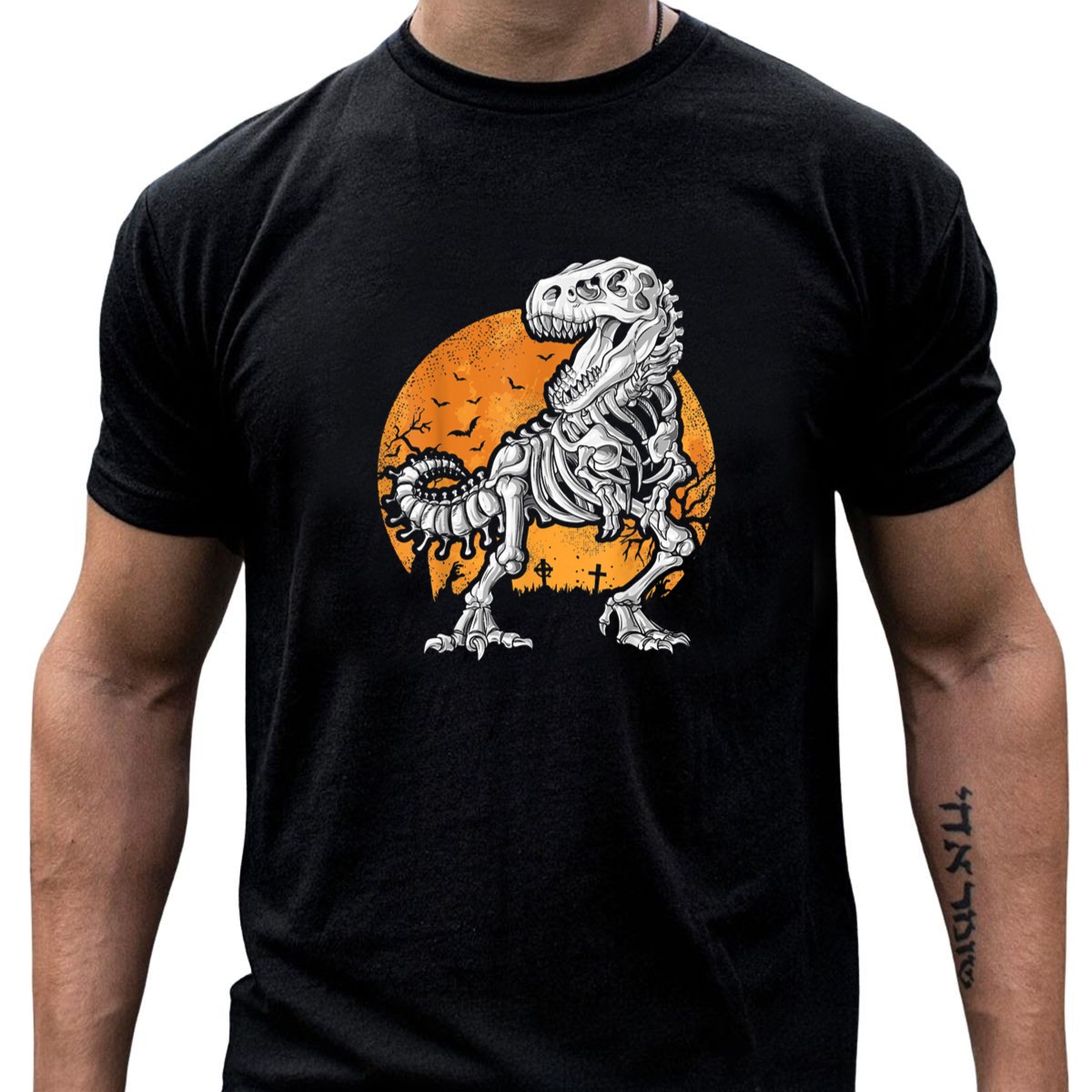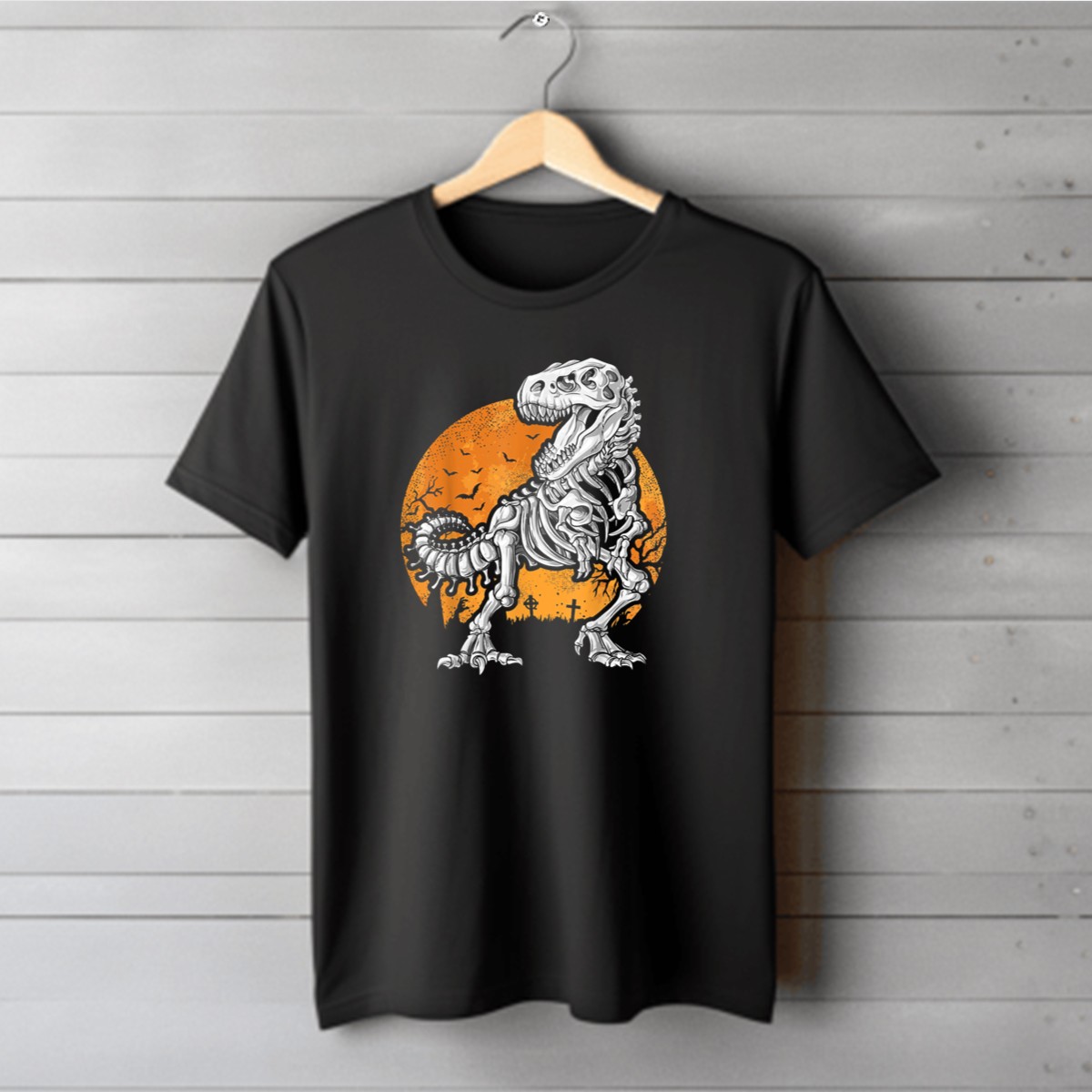 Embrace the spirit of Halloween with our Dinosaur Skeleton Halloween Scene T-Shirt, featuring a fierce T-Rex and playful bats amidst a spooky graveyard backdrop. This fan-made design is perfect for dinosaur enthusiasts and Halloween lovers alike, making it an ideal choice for themed events, casual outings, or just a fun day at home. Crafted with care in the USA, this shirt combines comfort with a unique style that will surely turn heads and spark conversations.
