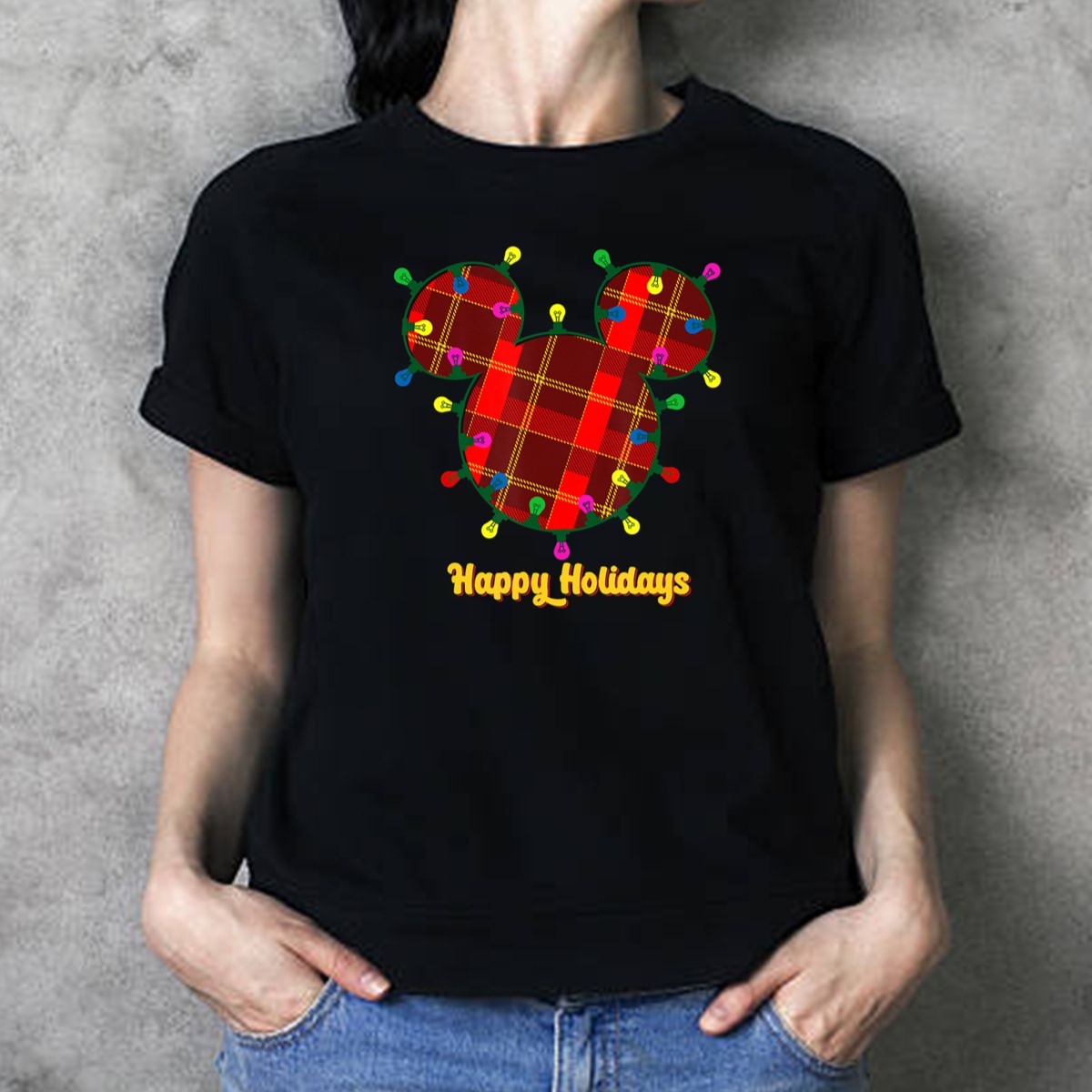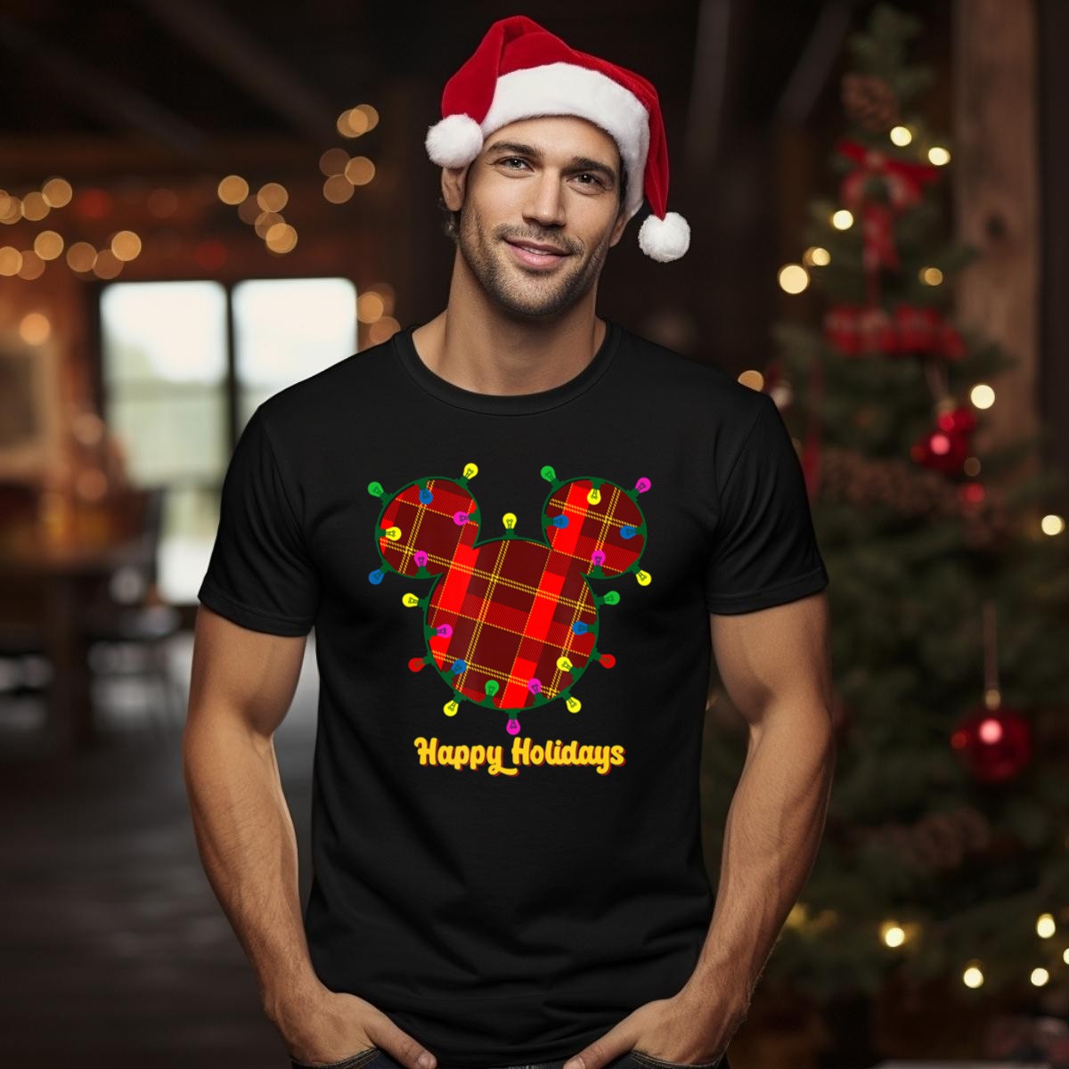 Celebrate the magic of the season with our Disney Mickey Happy Holidays Plaid Christmas Lights T-Shirt! This fan-made design is perfect for Disney enthusiasts and anyone looking to add a touch of festive cheer to their wardrobe. Ideal for casual outings, themed events, or daily wear, this shirt combines comfort and style, making it a must-have for all-season festivities. Printed in the USA, it’s a delightful way to show off your holiday spirit!