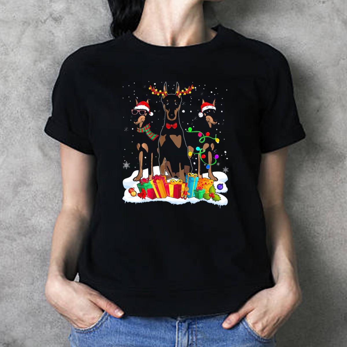 Celebrate the holiday season in style with our Doberman Christmas Santa Hat T-Shirt, featuring adorable reindeer antlers and festive holiday lights! This shirt is perfect for dog lovers and anyone who wants to add a fun twist to their casual wear. Made for themed events or daily outings, this fan-made design is sure to bring smiles and spread cheer wherever you go. Printed in the USA, this shirt combines comfort and holiday spirit seamlessly.