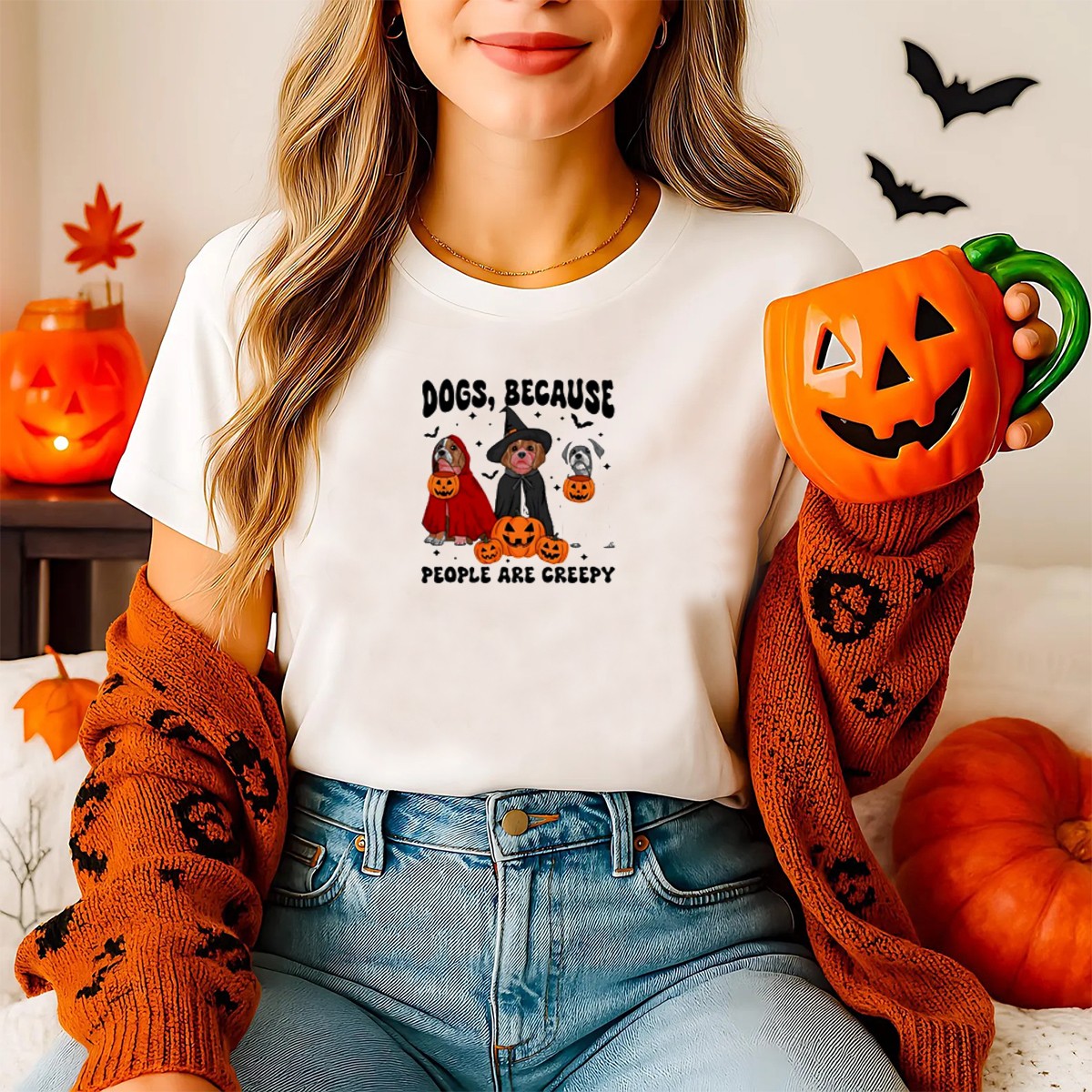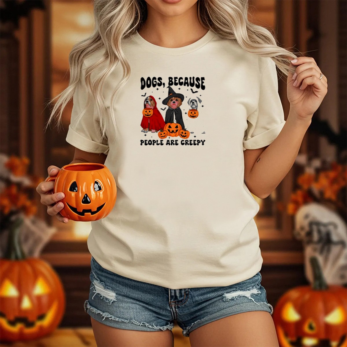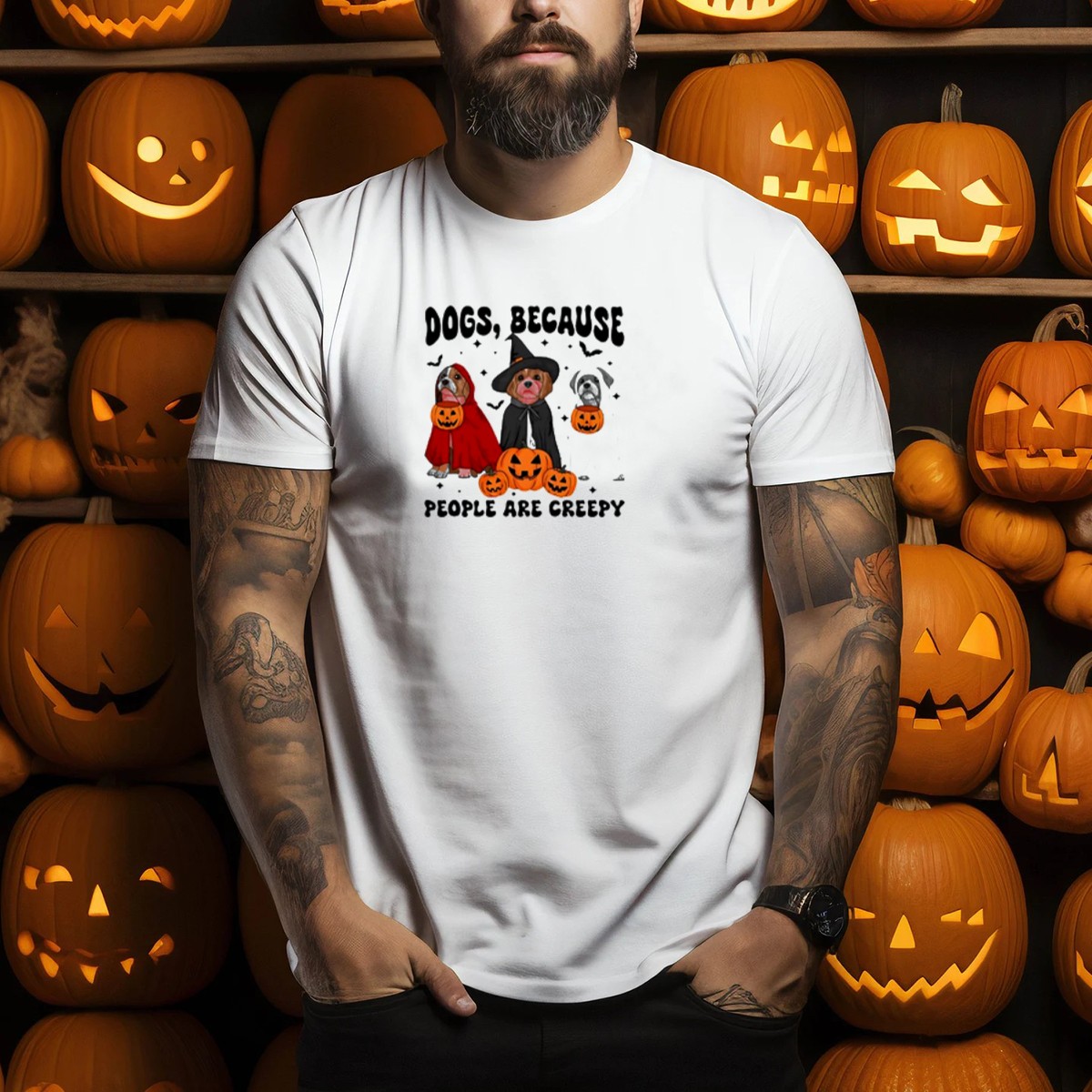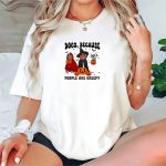 Celebrate the spookiest season with our “Dogs Because People Are Creepy” Halloween T-Shirt! This fan-made design features an adorable ghost dog wearing a witch hat and surrounded by pumpkins, making it the perfect attire for dog lovers who enjoy a playful twist on Halloween. Ideal for casual outings, themed events, or just lounging at home, this shirt combines comfort and style for all-season wear. Stand out while showing your love for dogs and the spirit of Halloween!