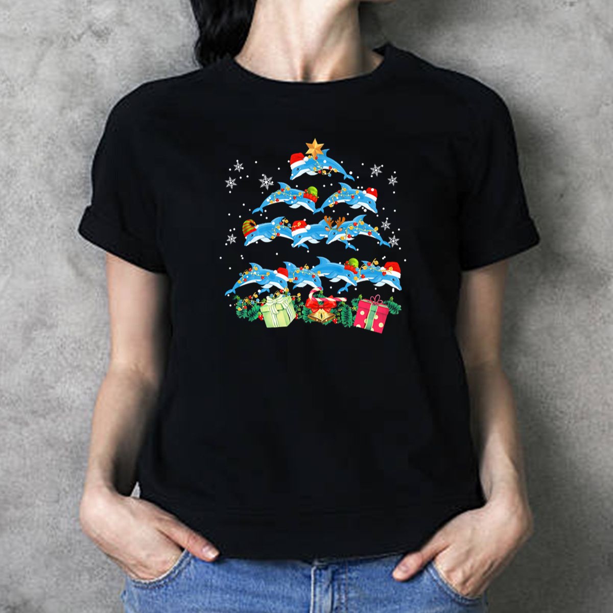 Celebrate the holiday season in style with our Dolphin Christmas Tree T-Shirt, featuring a whimsical design of dolphins adorned with Santa hats and festive lights. Perfect for ocean lovers and holiday enthusiasts alike, this shirt is ideal for casual outings, themed events, or simply spreading cheer during daily wear. Made with care and printed in the USA, this fan-made design is sure to make you stand out at any celebration.