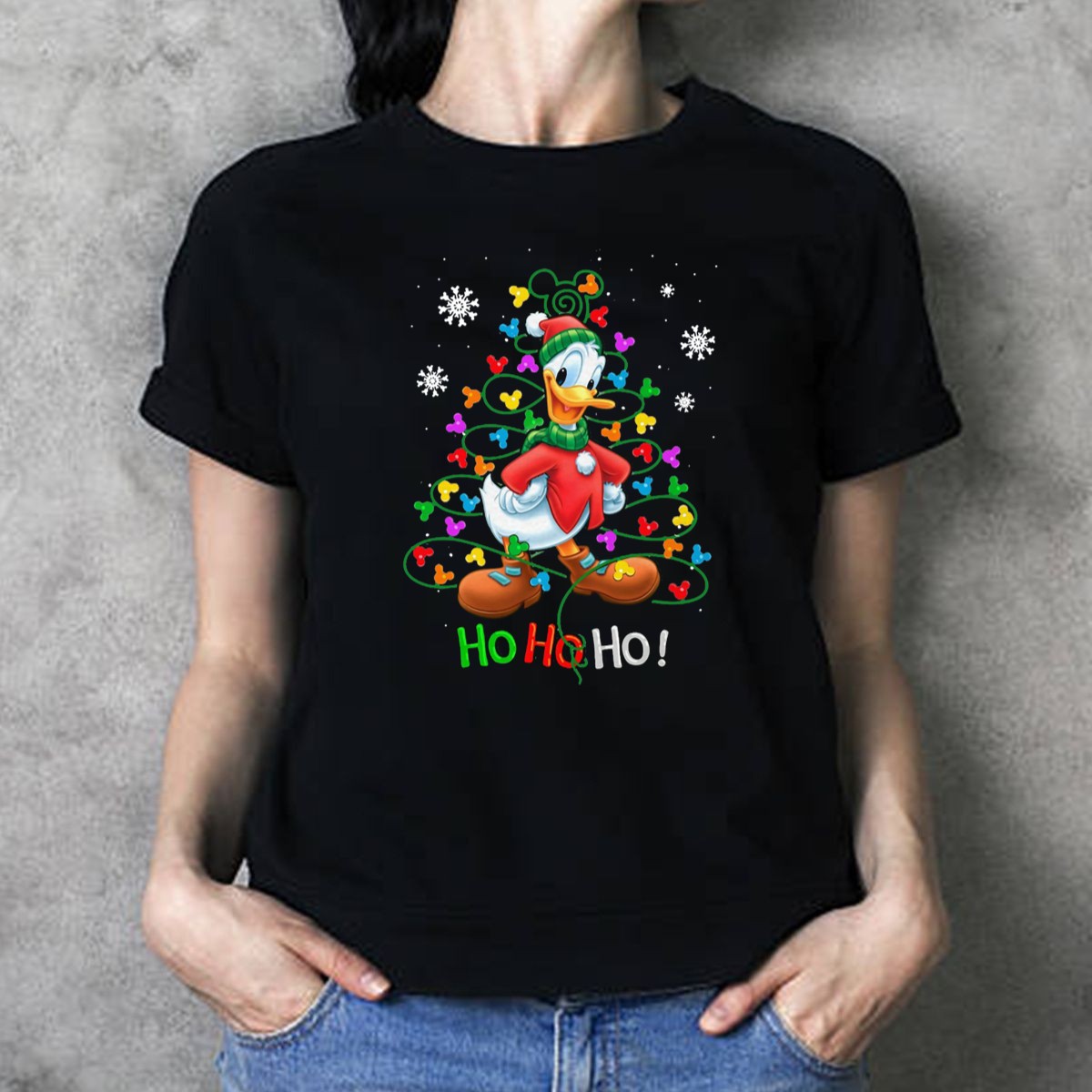 Celebrate the festive season with our Donald Duck Ho Ho Ho Christmas Lights Snowflakes T-Shirt! This whimsical design is perfect for Disney fans and anyone looking to spread holiday cheer. Made for casual wear, themed events, or just to add a bit of fun to your daily outfit, this shirt will keep you stylish and comfortable all season long. Its unique fan-made design, printed right here in the USA, makes it a must-have for your holiday wardrobe!