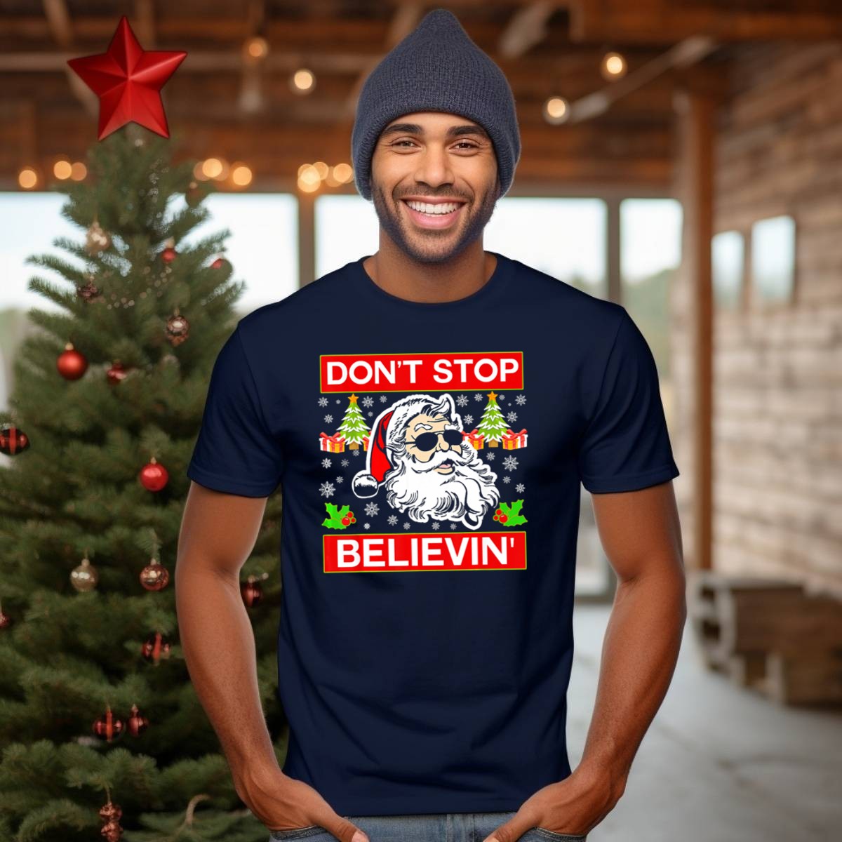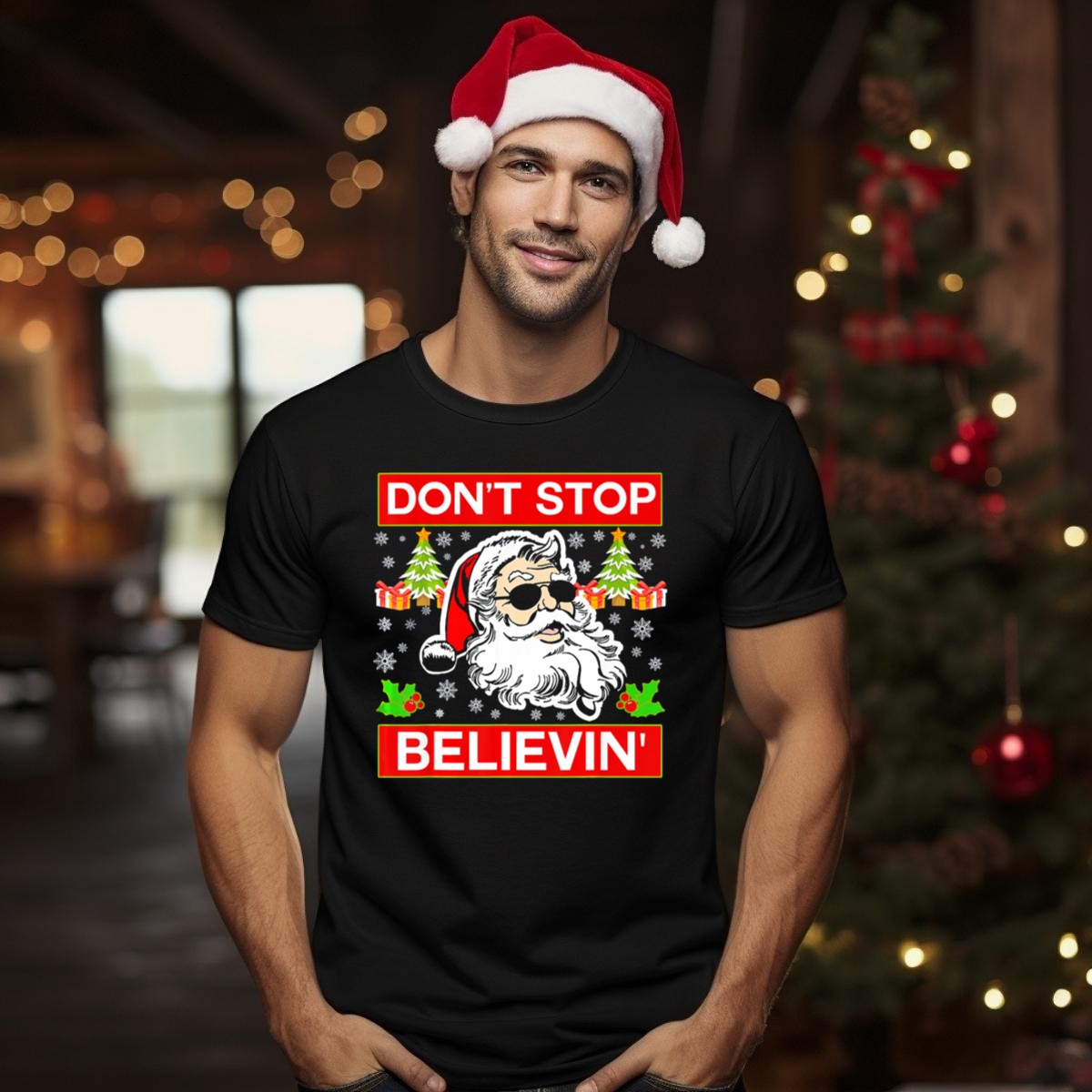 Get into the festive spirit with our “Don’t Stop Believin” Funny Santa T-Shirt! Perfect for holiday parties, casual gatherings, or just spreading cheer around town, this shirt features a playful design of Santa rocking sunglasses and surrounded by Christmas gifts. It’s an ideal choice for anyone who loves to celebrate the season with a touch of humor. Made for comfort and style, this shirt is a must-have for your holiday wardrobe!