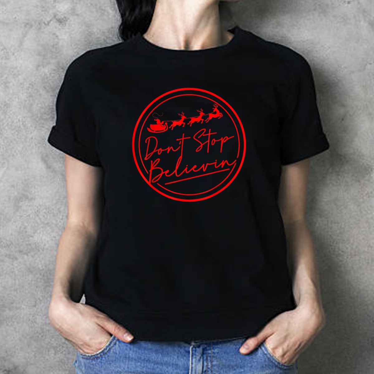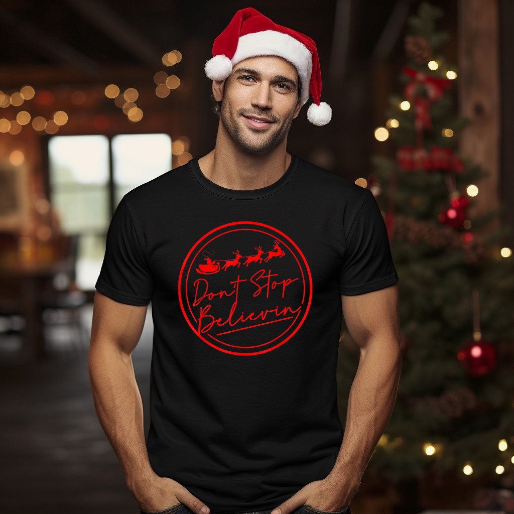 Celebrate the magic of the holiday season with our “Don’t Stop Believin Santa Claus Christmas Reindeer Sleigh T-Shirt”! This fun and festive graphic tee is perfect for the whole family, making it an ideal choice for casual wear, themed events, or daily holiday festivities. Crafted with a fan-made design and printed in the USA, this shirt combines comfort and style, ensuring you spread cheer wherever you go!