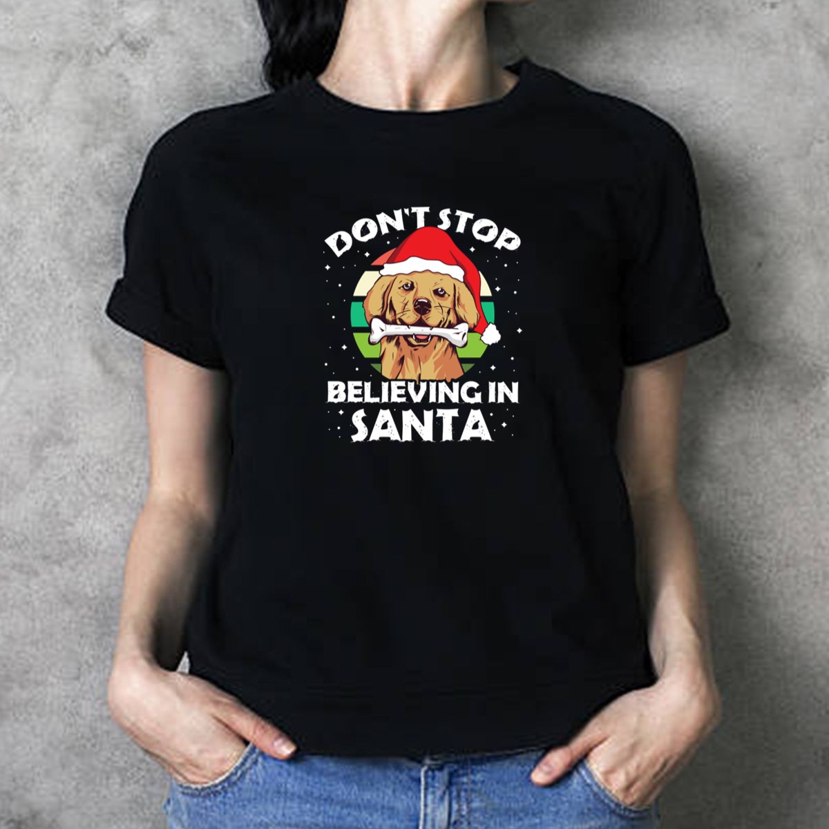 Celebrate the holiday season with our “Don’t Stop Believing In Santa” Golden Retriever Christmas Funny Dog T-Shirt! Perfect for dog lovers and festive enthusiasts alike, this playful and heartwarming design is ideal for casual outings, themed events, or simply spreading cheer during daily wear. Made for comfort and style, this shirt is a unique addition to your holiday wardrobe, showcasing your love for both Christmas and your furry friends.