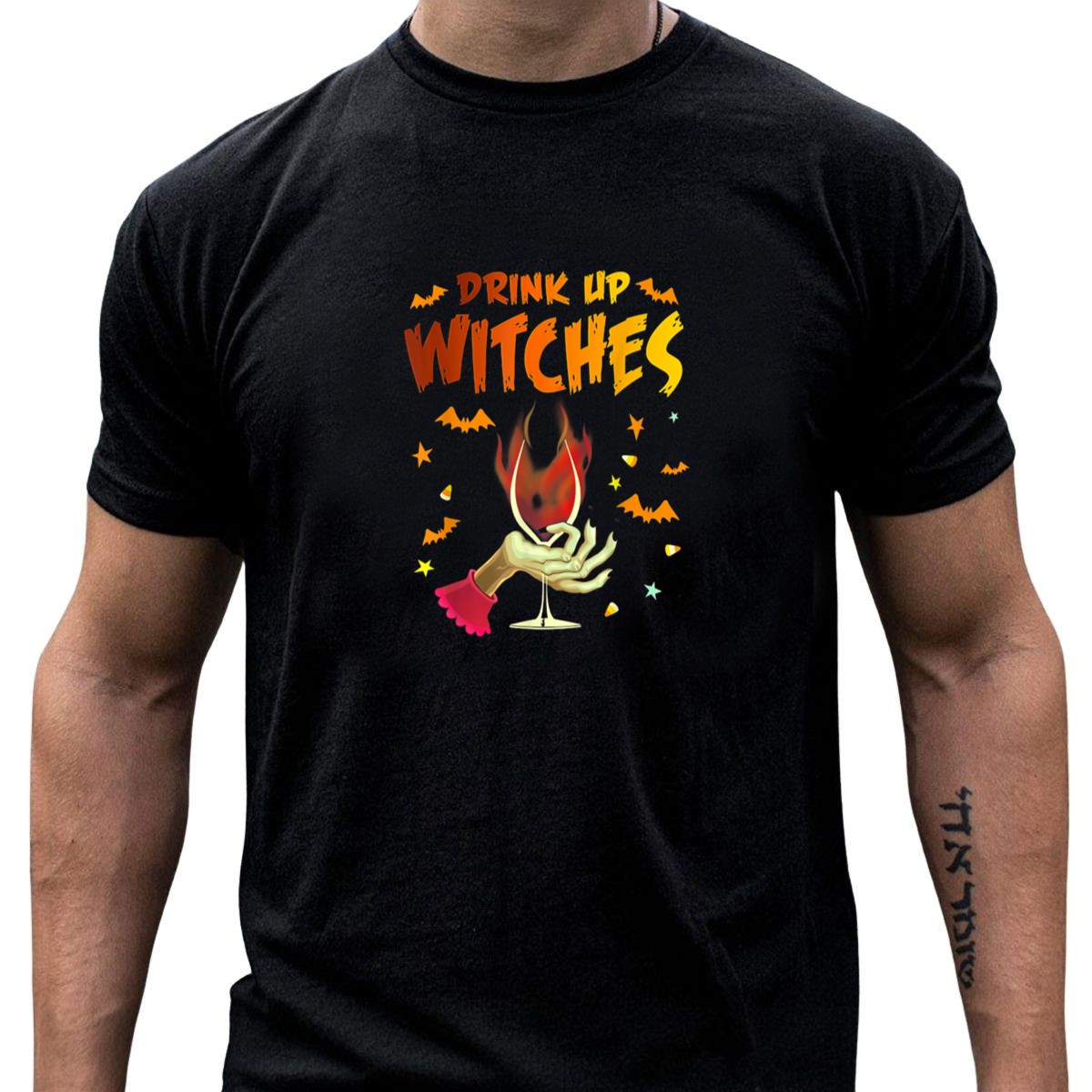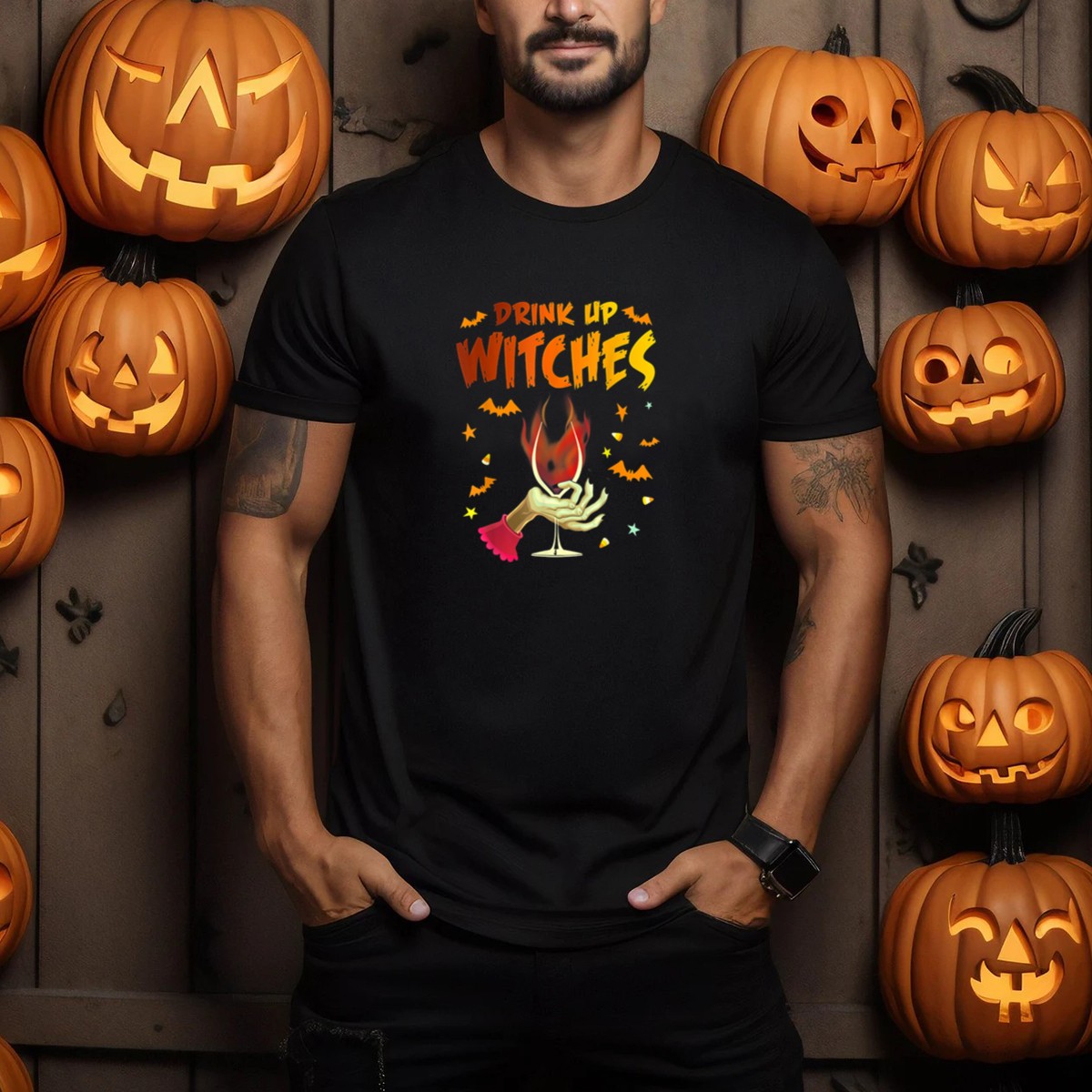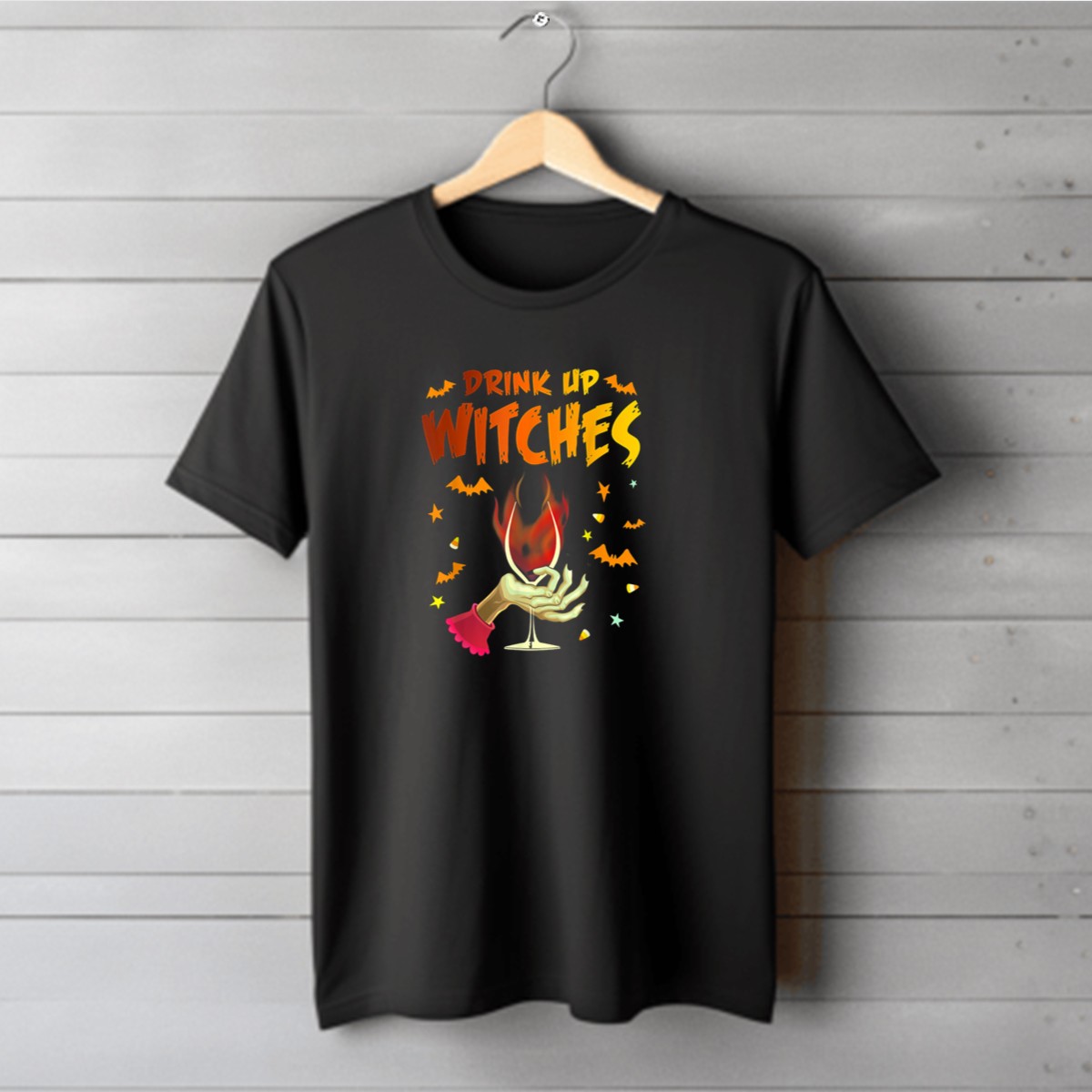 Embrace the spirit of Halloween with our “Drink Up Witches” graphic T-shirt, perfect for all the fun-loving witches out there! This fan-made design features a whimsical witch hand holding a wine glass, surrounded by playful bats and candy corn, making it an ideal choice for themed events, casual gatherings, or your daily wear during the spooky season. Crafted for comfort and style, this T-shirt is sure to be a standout in your wardrobe.