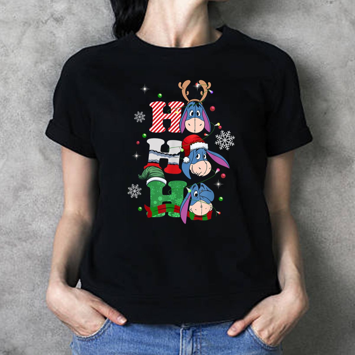 Be the first to review “Eeyore Christmas Donkey Santa Reindeer Ho Ho Ho Snowflakes T Shirt”