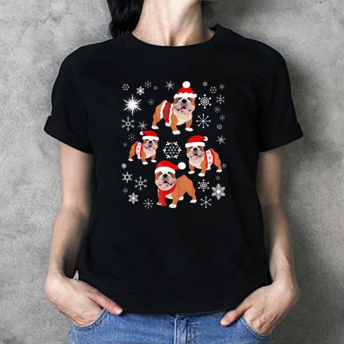 Be the first to review “English Bulldog Christmas Santa Hat And Snowflakes T-Shirt”