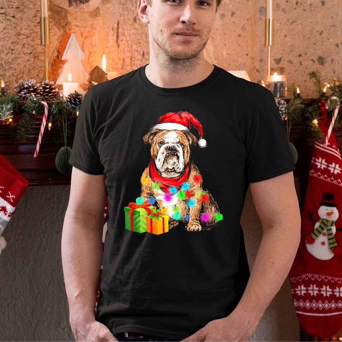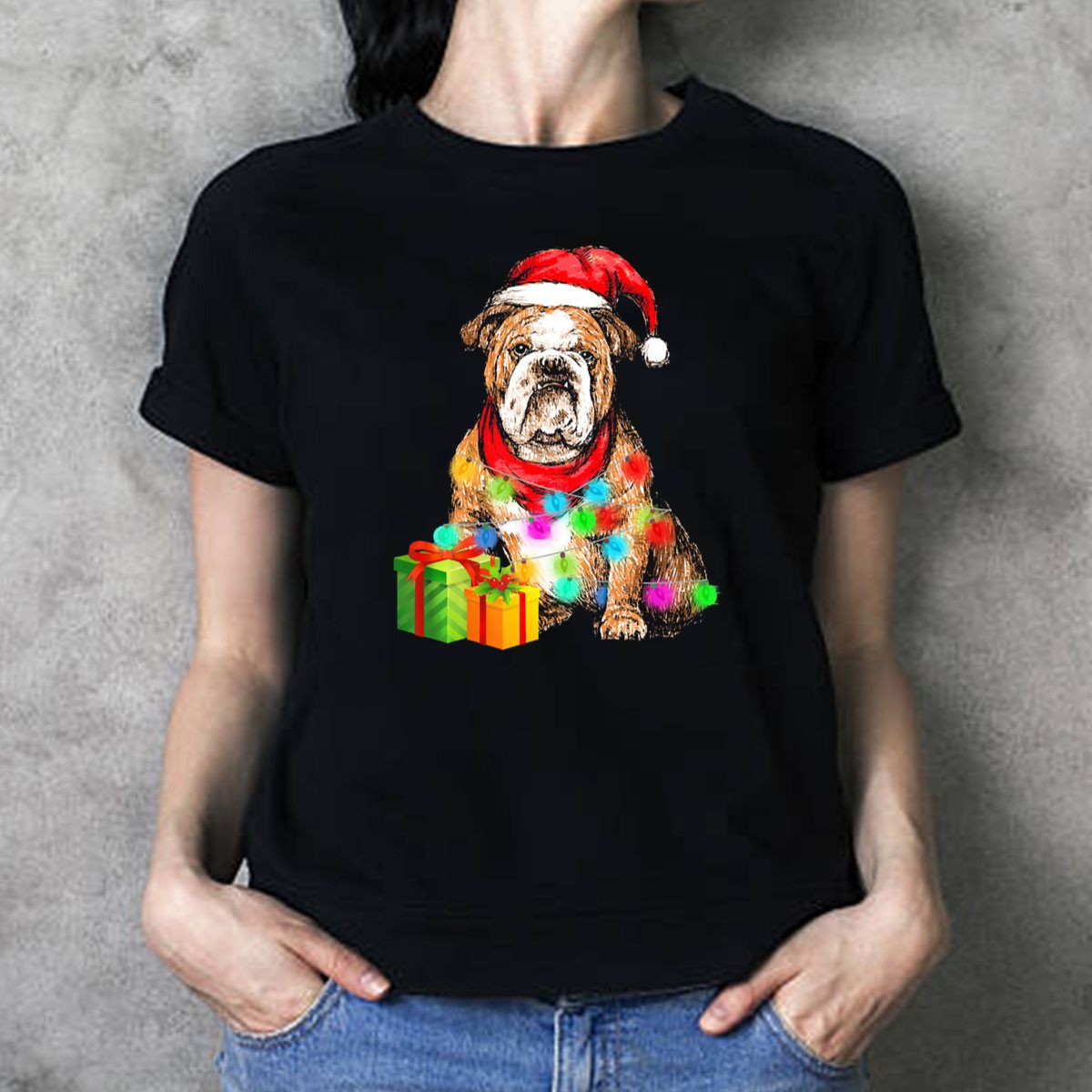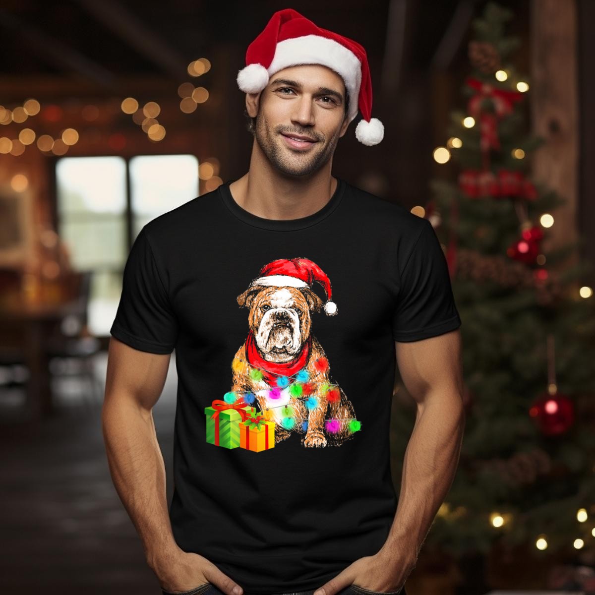 Celebrate the festive season in style with our English Bulldog Christmas T-Shirt, featuring an adorable design of a bulldog donning a Santa hat, wrapped in vibrant lights, and surrounded by presents. This shirt is perfect for dog lovers and anyone looking to spread holiday cheer at casual gatherings, themed events, or simply while enjoying daily wear. Made with fan-made designs printed in the USA, this tee combines comfort with holiday spirit, making it a unique addition to your wardrobe.