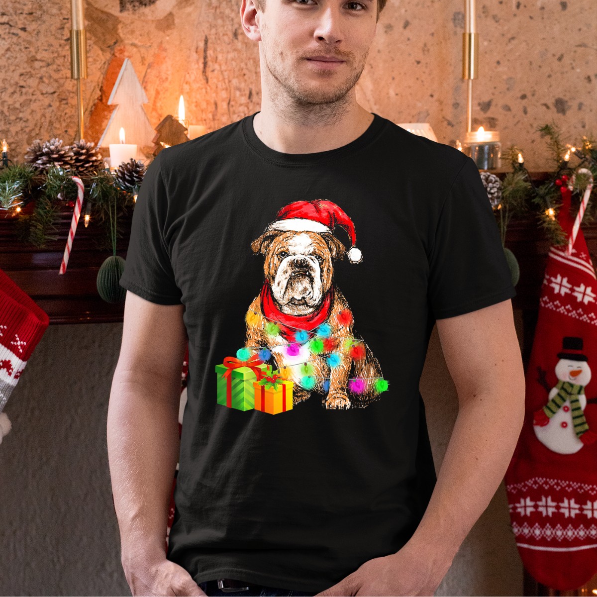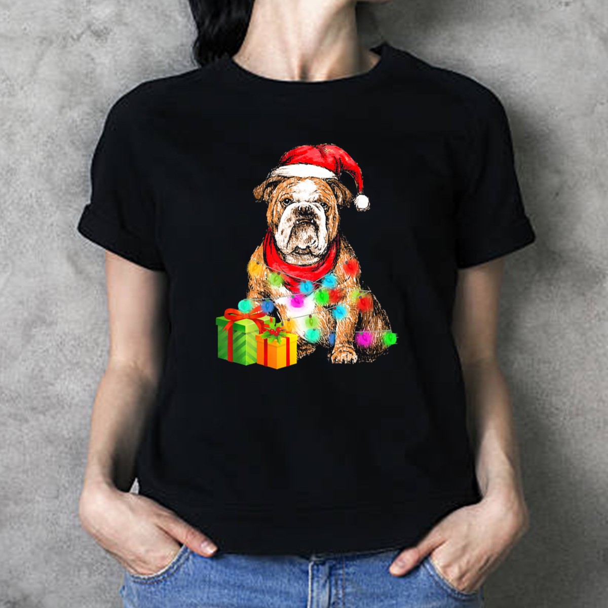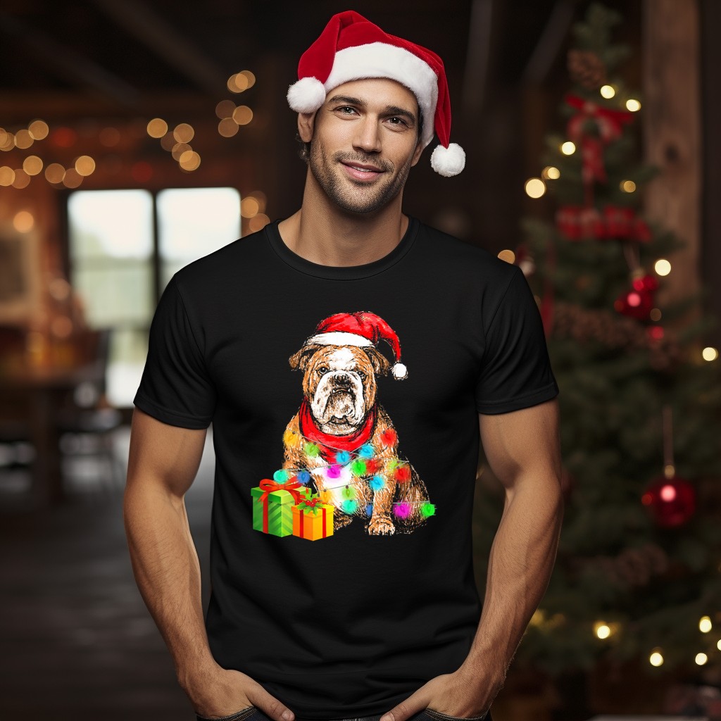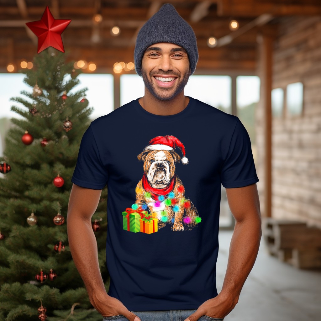 Celebrate the holiday season with our English Bulldog Christmas Santa Hat Wrapped In Lights T-Shirt! This festive tee is perfect for dog lovers and anyone who enjoys a good laugh during the holidays. Whether you’re attending a casual get-together, a themed event, or just lounging at home, this fun design will surely spread cheer and warmth. Made with care in the USA, this fan-made graphic tee combines comfort and style, making it a must-have for any wardrobe.