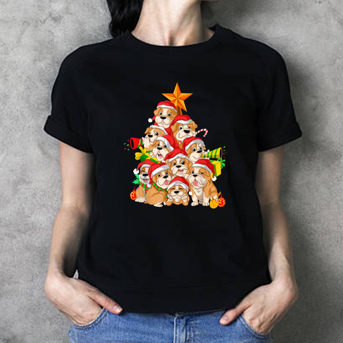 Celebrate the joy of the holiday season with our English Bulldog Puppies Christmas Tree T-Shirt, a perfect blend of festive spirit and adorable charm. Designed for dog lovers and holiday enthusiasts alike, this shirt features a delightful print of playful bulldog puppies surrounded by a beautifully decorated Christmas tree, all decked out in Santa hats and surrounded by presents. Ideal for casual wear, themed events, or daily outings during the festive season, this shirt is sure to spread smiles wherever you go!