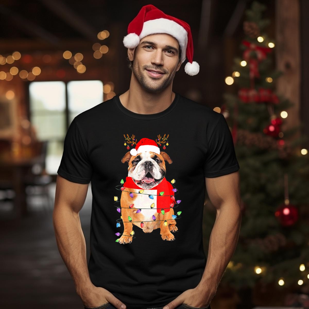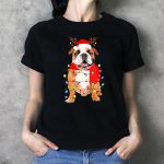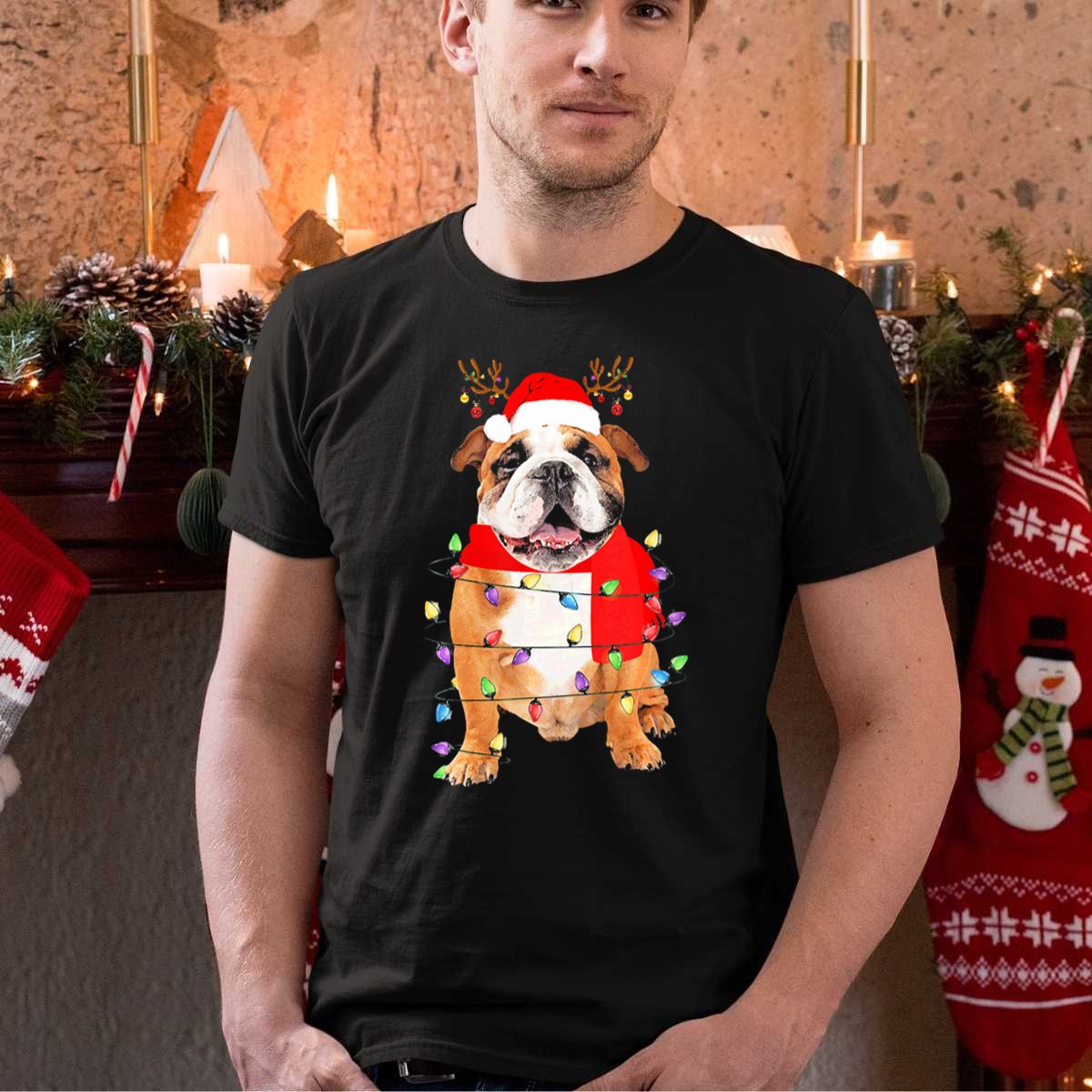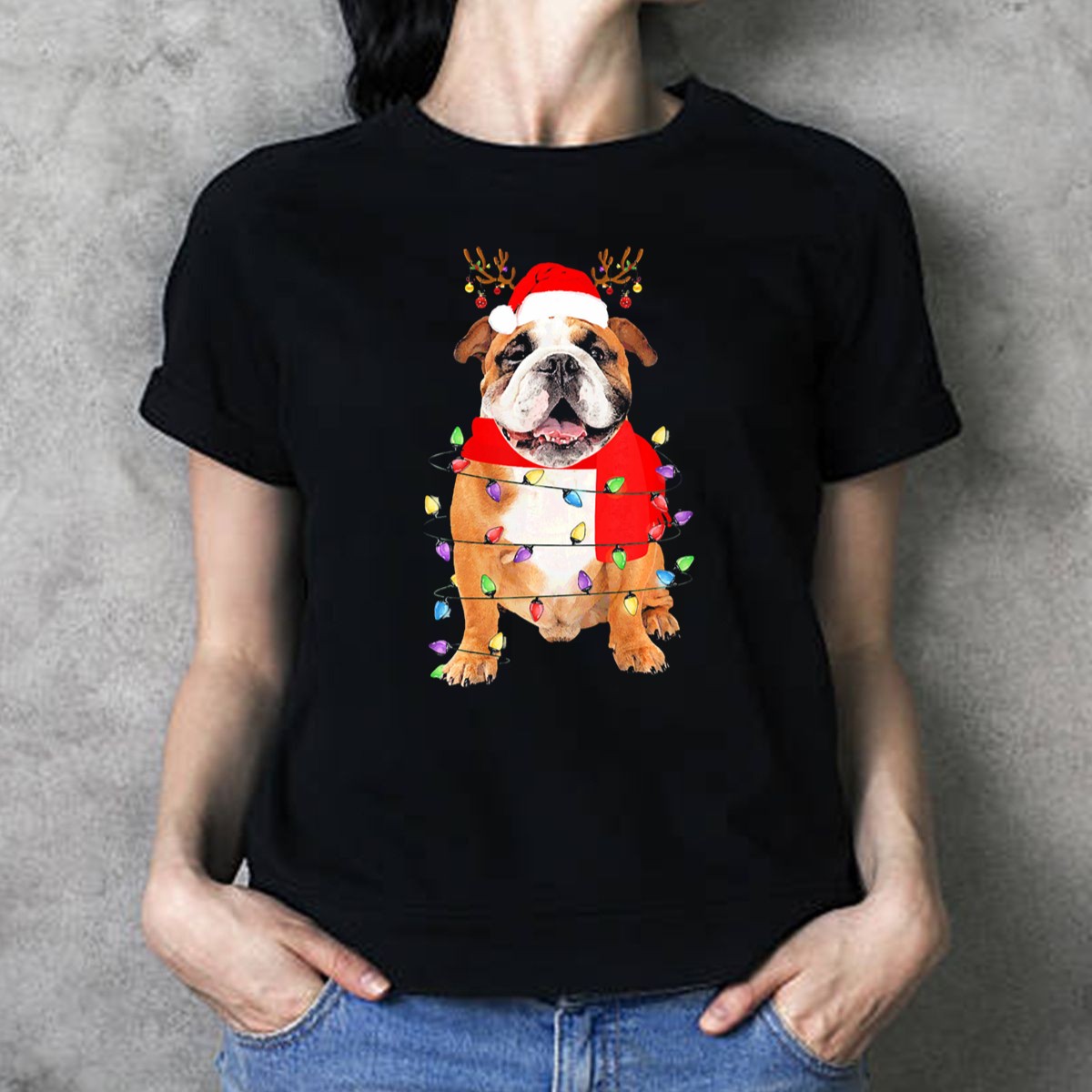 English Bulldog Reindeer Christmas Santa Lights Scarf T Shirt