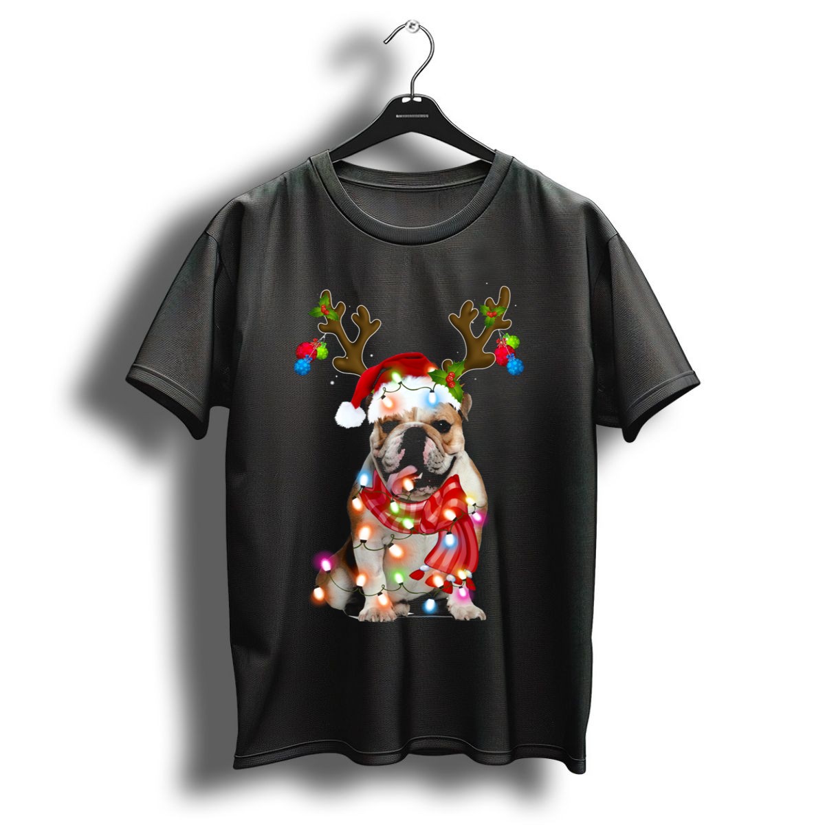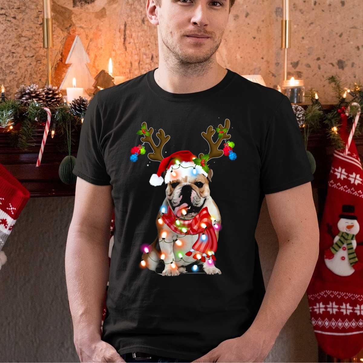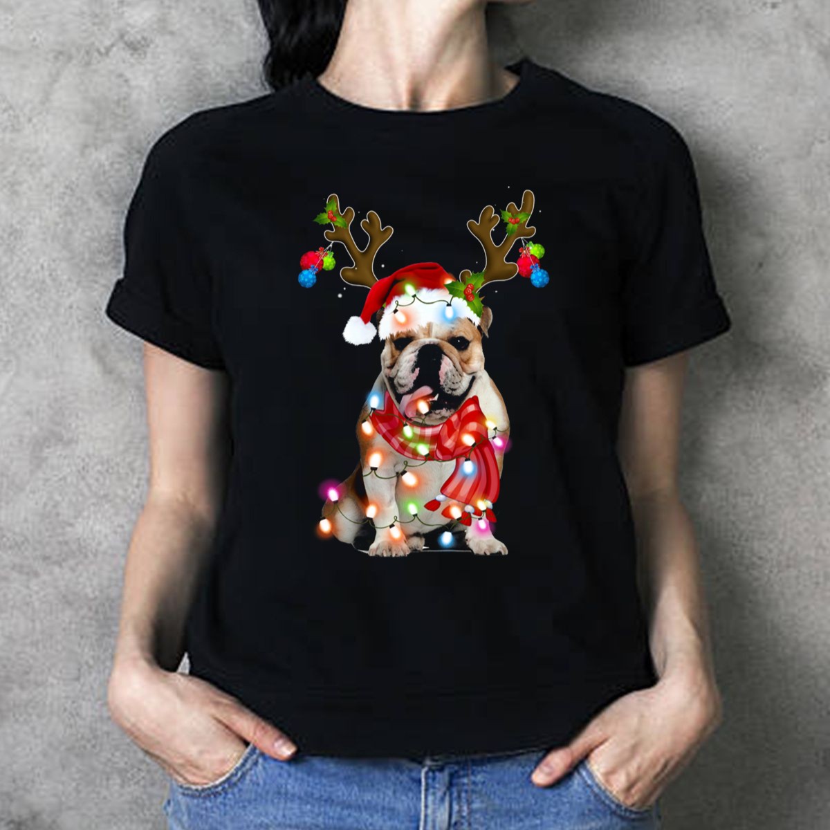 English Bulldog Santa Hat Reindeer Antlers Christmas Lights Scarf T Shirt