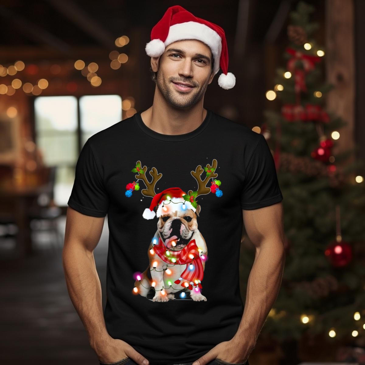 Be the first to review “English Bulldog Santa Hat Reindeer Antlers Christmas Lights Scarf T Shirt”