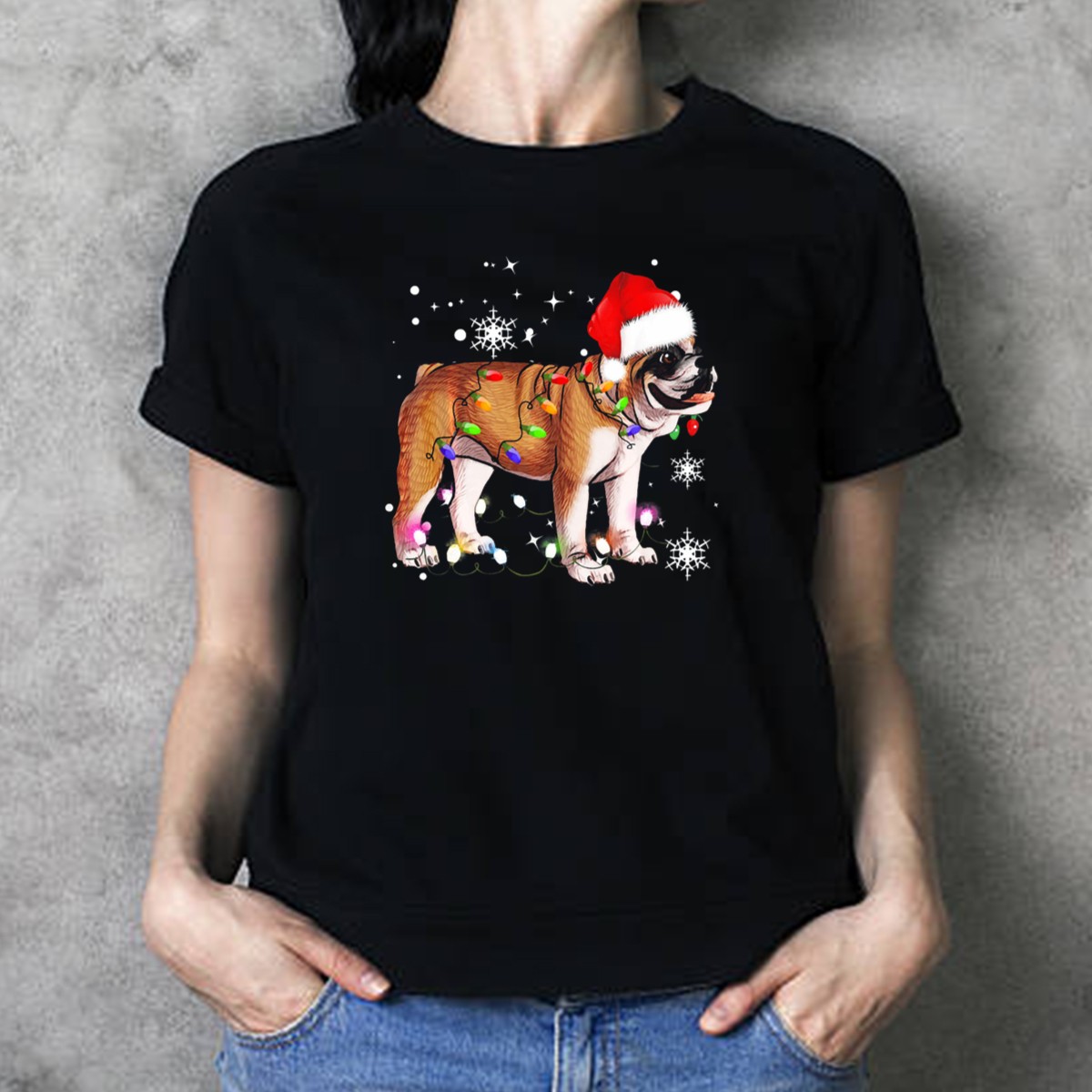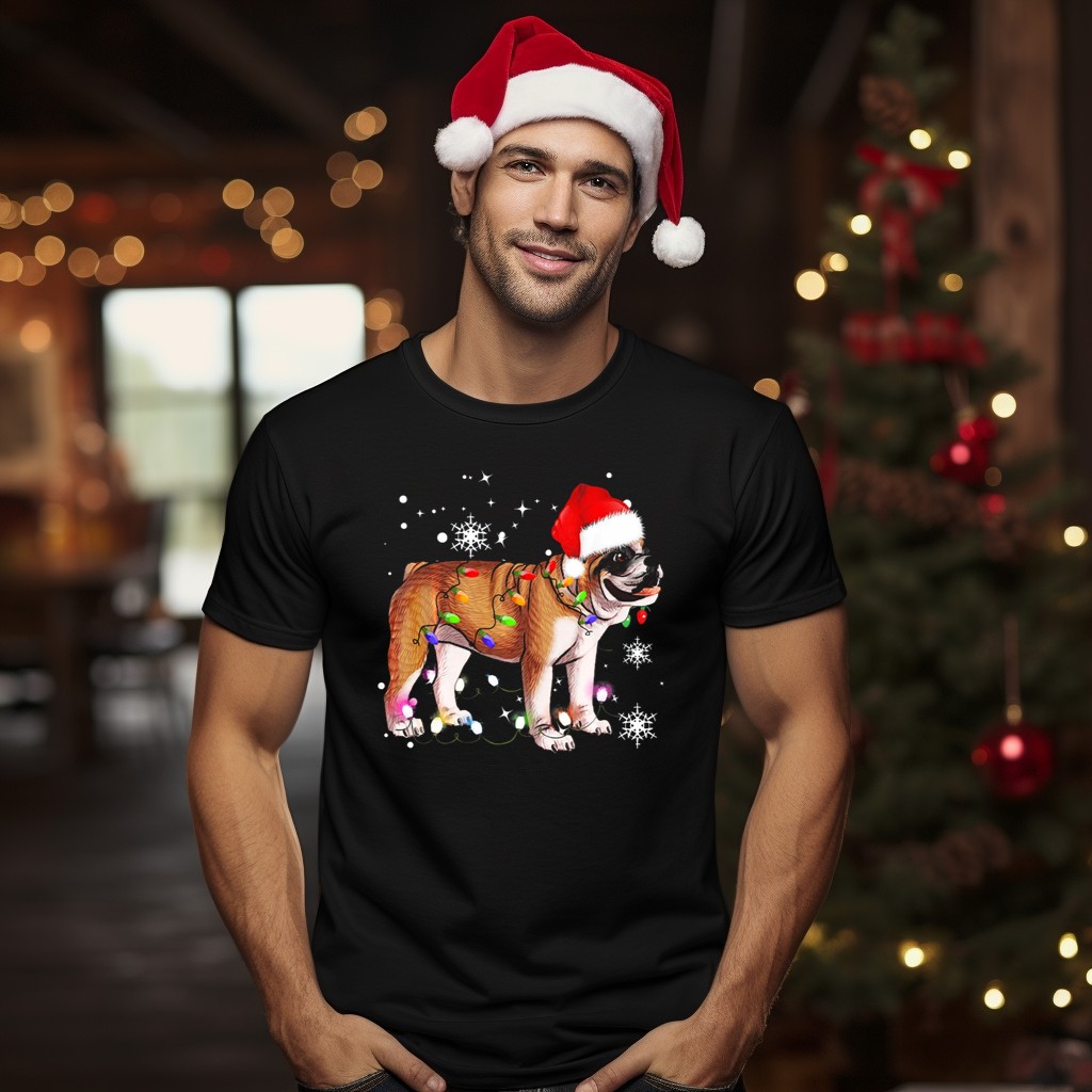 Celebrate the festive season with our adorable English Bulldog With Christmas Lights And Santa Hat Snowflakes T-Shirt! Perfect for dog lovers and holiday enthusiasts alike, this fan-made design brings together charm and cheer, making it an ideal choice for casual wear, themed events, or simply spreading holiday joy. Crafted for comfort and style, this classic fit tee is sure to become a favorite in your wardrobe.