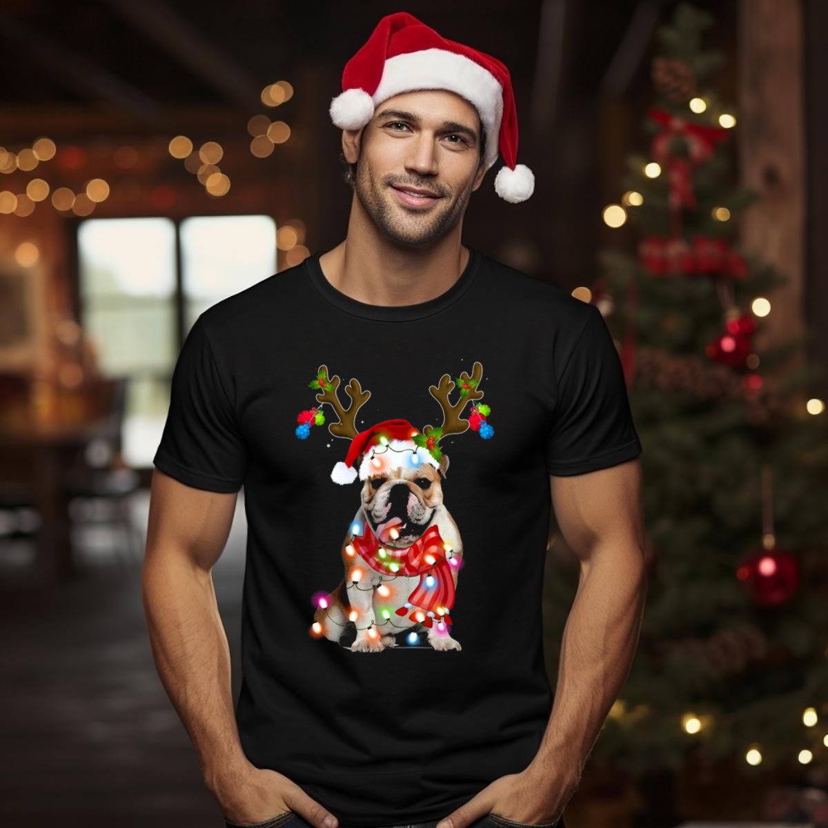 Be the first to review “English Bulldog With Santa Hat Reindeer Antlers And Christmas Lights T Shirt”