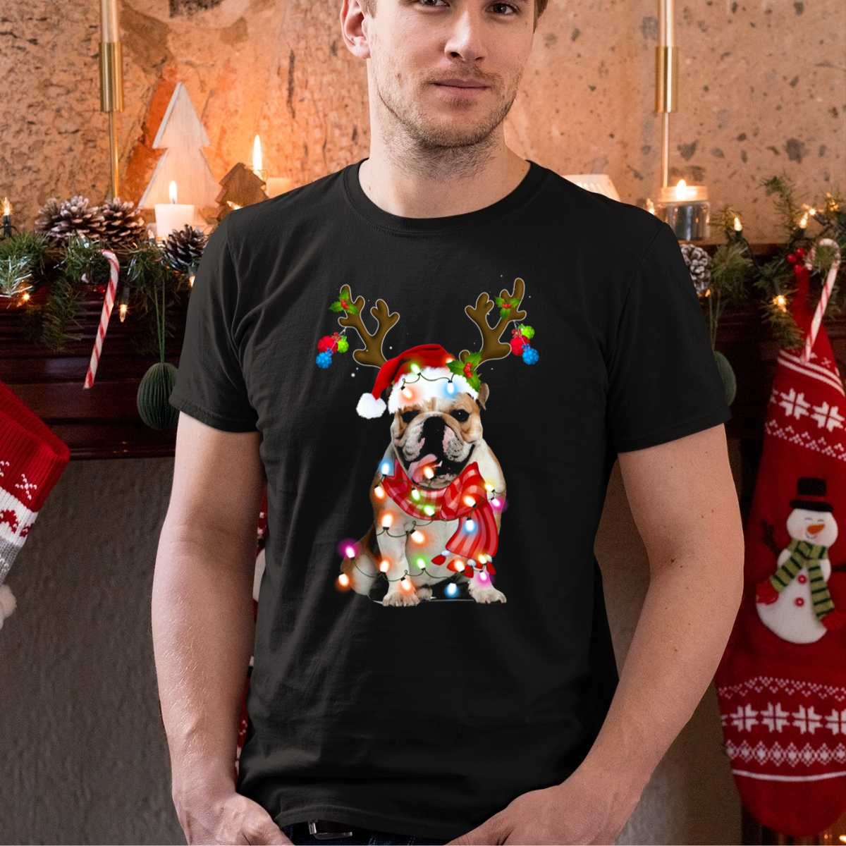 English Bulldog With Santa Hat Reindeer Antlers And Christmas Lights T Shirt