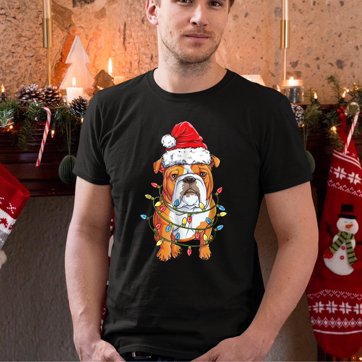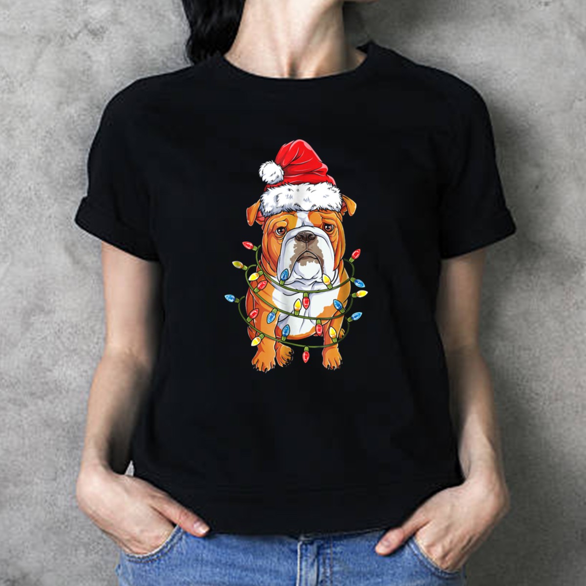 Celebrate the festive spirit with our English Bulldog Wrapped In Christmas Lights Wearing Santa Hat T-Shirt! Perfect for dog lovers and holiday enthusiasts alike, this fun and whimsical design captures the joy of the season. Ideal for casual wear, themed events, or simply spreading cheer during your daily outings, this shirt is a must-have for anyone looking to showcase their love for both pups and Christmas. Printed in the USA, this fan-made design brings a unique flair to your wardrobe.