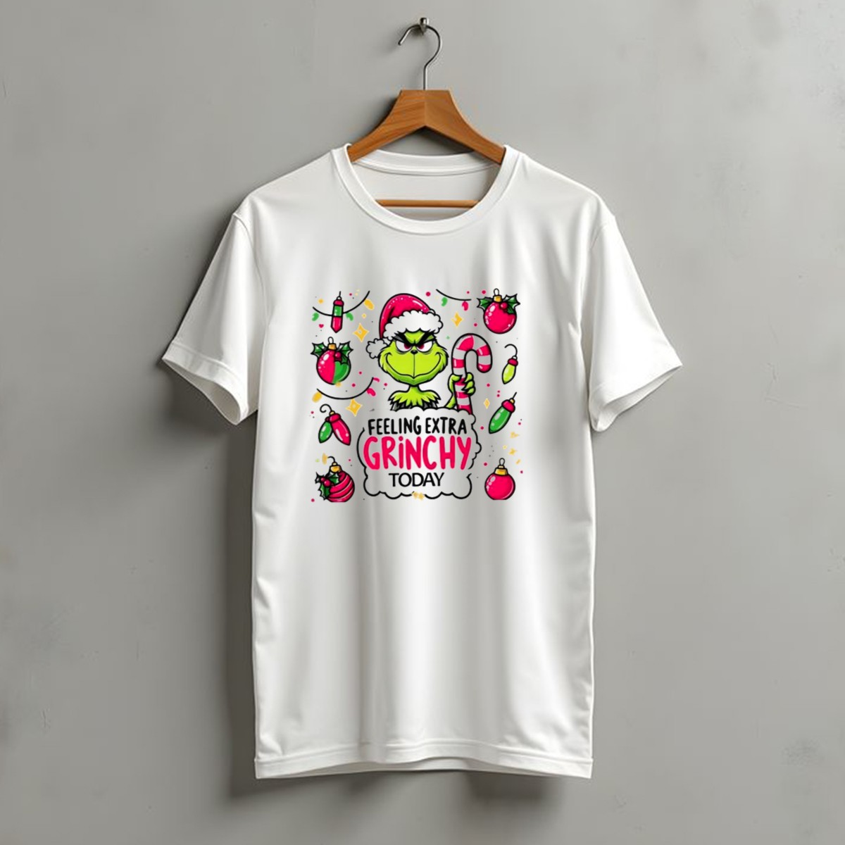 Get ready to spread some holiday cheer with our “Feeling Extra Grinchy Today” T-shirt! Perfect for those who love to embrace their inner Grinch during the festive season, this shirt is ideal for casual wear, themed events, or just lounging around while sipping hot cocoa. Featuring a whimsical design of a Santa hat and candy cane ornaments, this fan-made graphic tee is printed in the USA, making it a unique addition to your holiday wardrobe that showcases your fun-loving spirit!