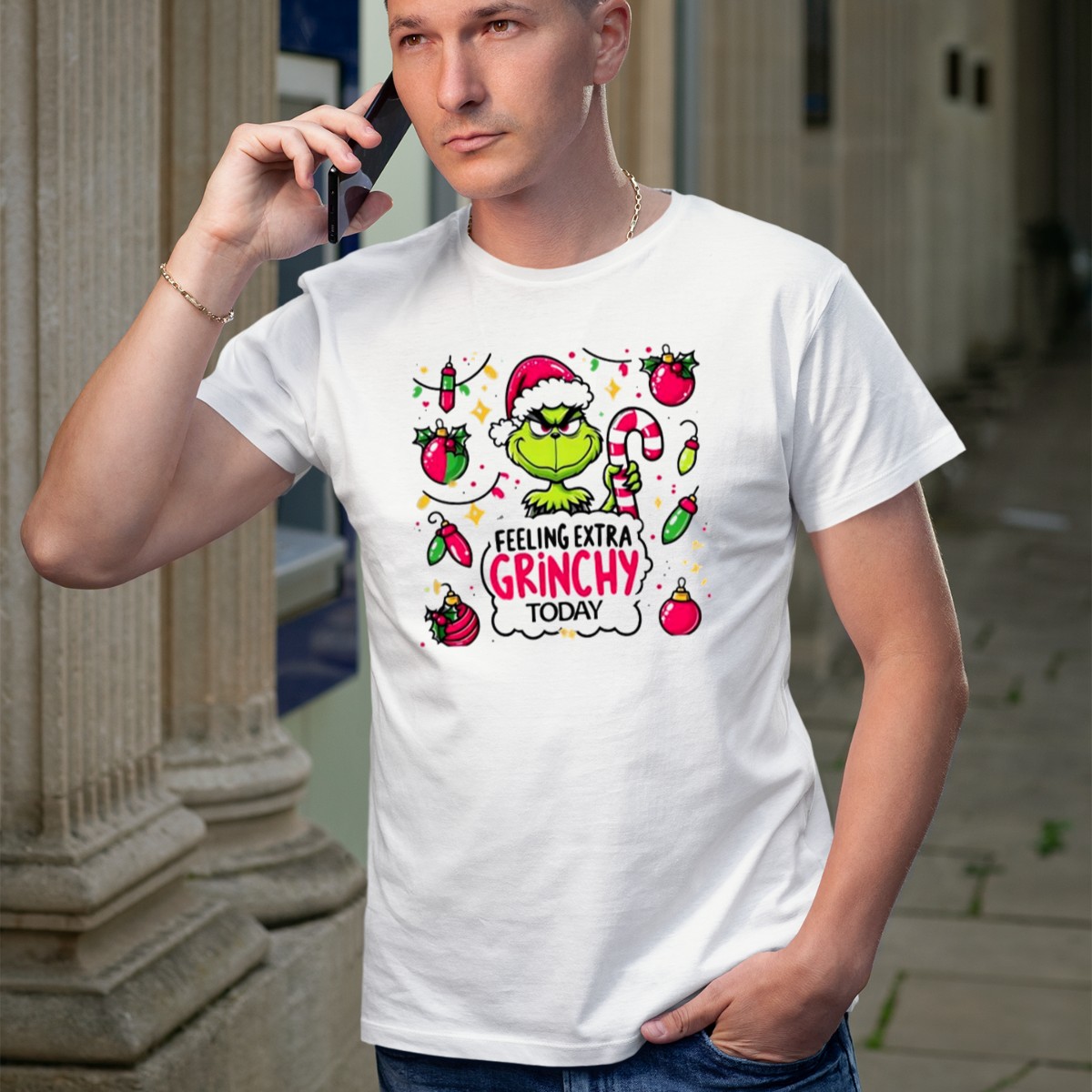 Be the first to review “Feeling Extra Grinchy Today Christmas Grinch Santa Hat Candy Cane Ornaments T-Shirt”