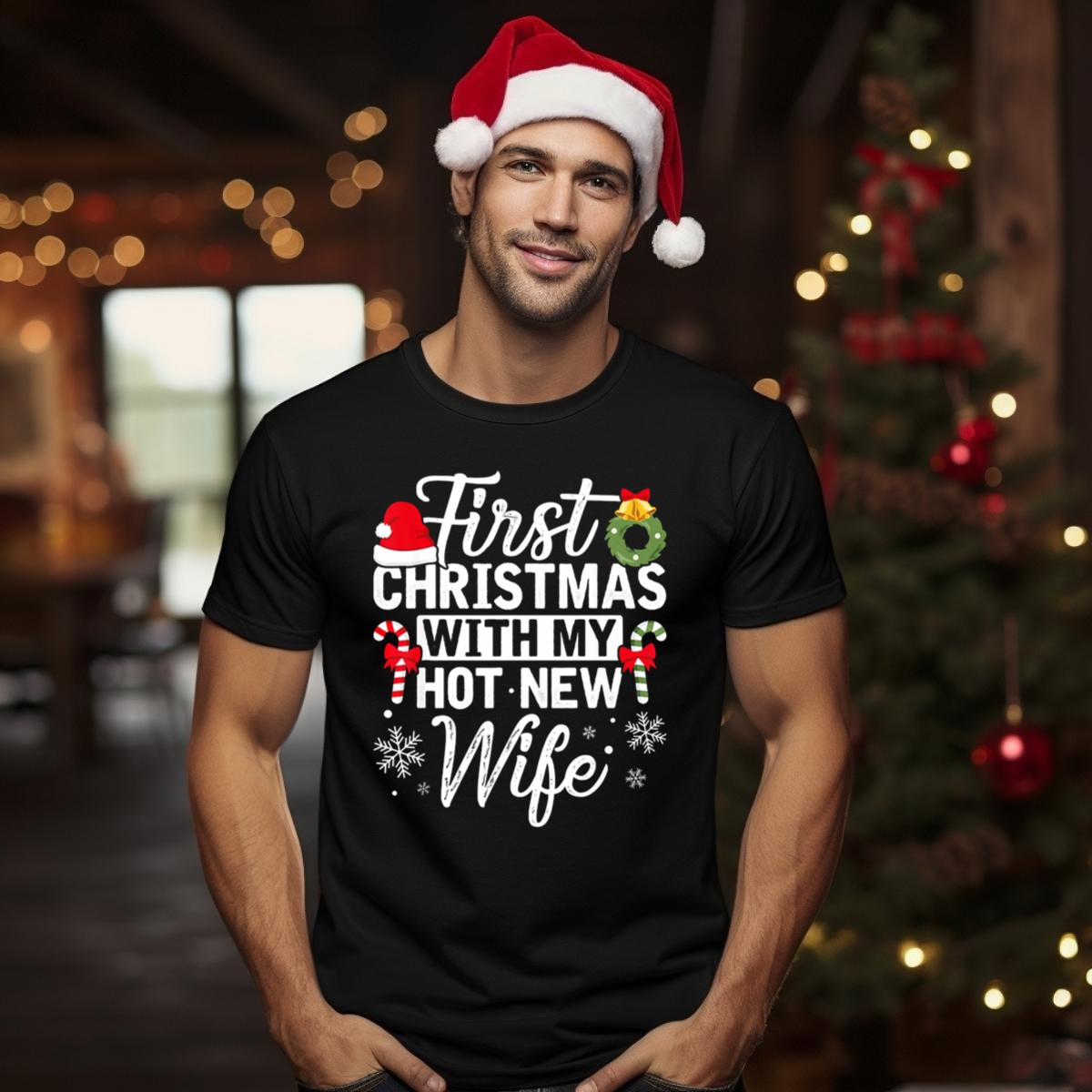 Celebrate your first Christmas with your hot new wife in style! This fun and festive T-shirt features a playful design that captures the magic of the season, making it perfect for themed events, casual outings, or cozy family gatherings. Crafted from soft and breathable fabric, this shirt ensures comfort while spreading holiday cheer wherever you go. Stand out with this unique fan-made design, proudly printed in the USA!