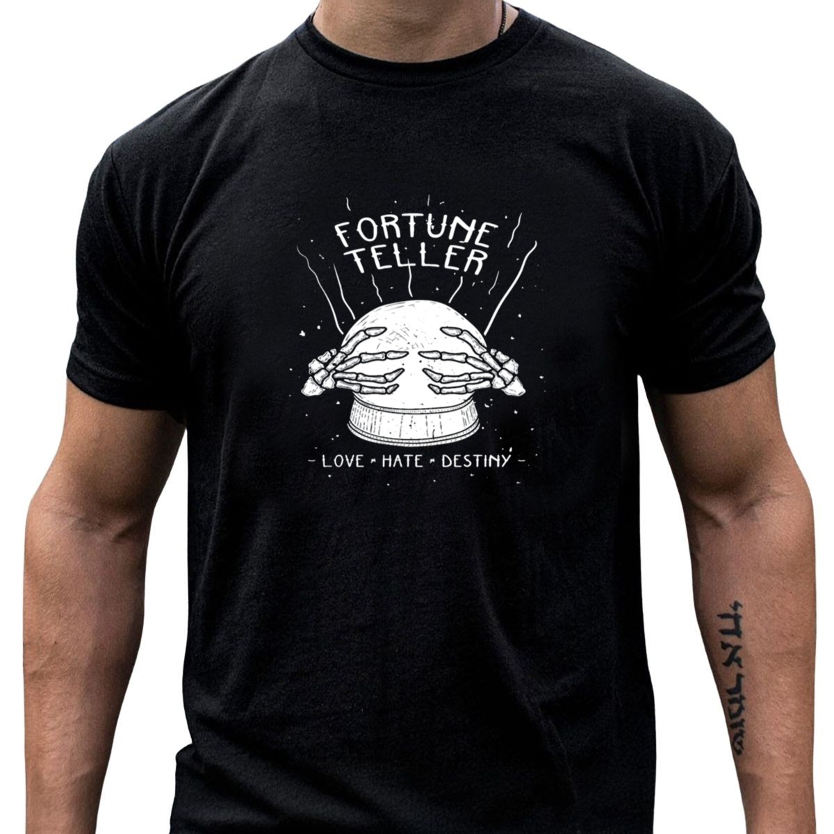 Embrace the mystical allure of the Fortune Teller Skeleton Love Hate Destiny T-Shirt, perfect for those who revel in the whims of fate and the spirit of Halloween. This fan-made design captures the essence of the season, making it an ideal choice for themed events, casual outings, or simply showcasing your unique style. Crafted with care in the USA, this shirt not only reflects your passion for the enigmatic but also offers unmatched comfort and durability.