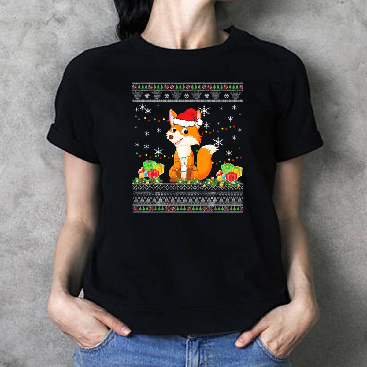 Fox Ugly Christmas Funny Lights Snowflakes Presents T-Shirt