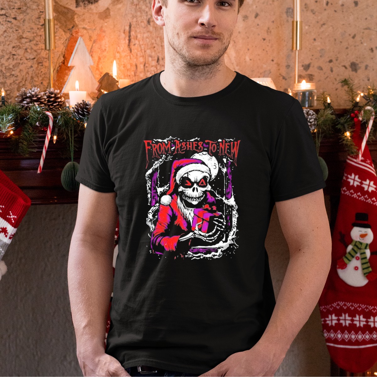 Embrace the spirit of the season with our From Ashes To New 2025 Nightmare Before Christmas Santa Skull T-Shirt, perfect for fans of the iconic film! This uniquely designed shirt blends a festive theme with a touch of edgy style, making it a great choice for casual wear, themed events, or daily outings. Crafted with care in the USA, this shirt not only showcases your love for the beloved classic but also offers comfort and durability for all-season wear.