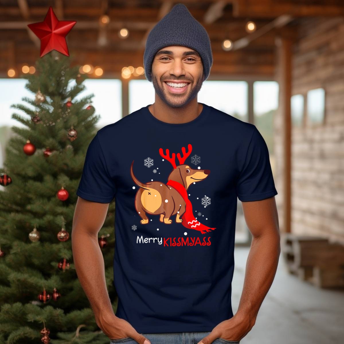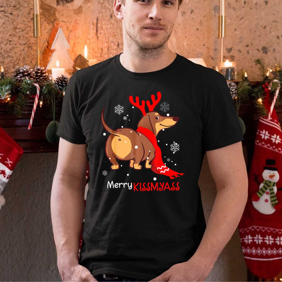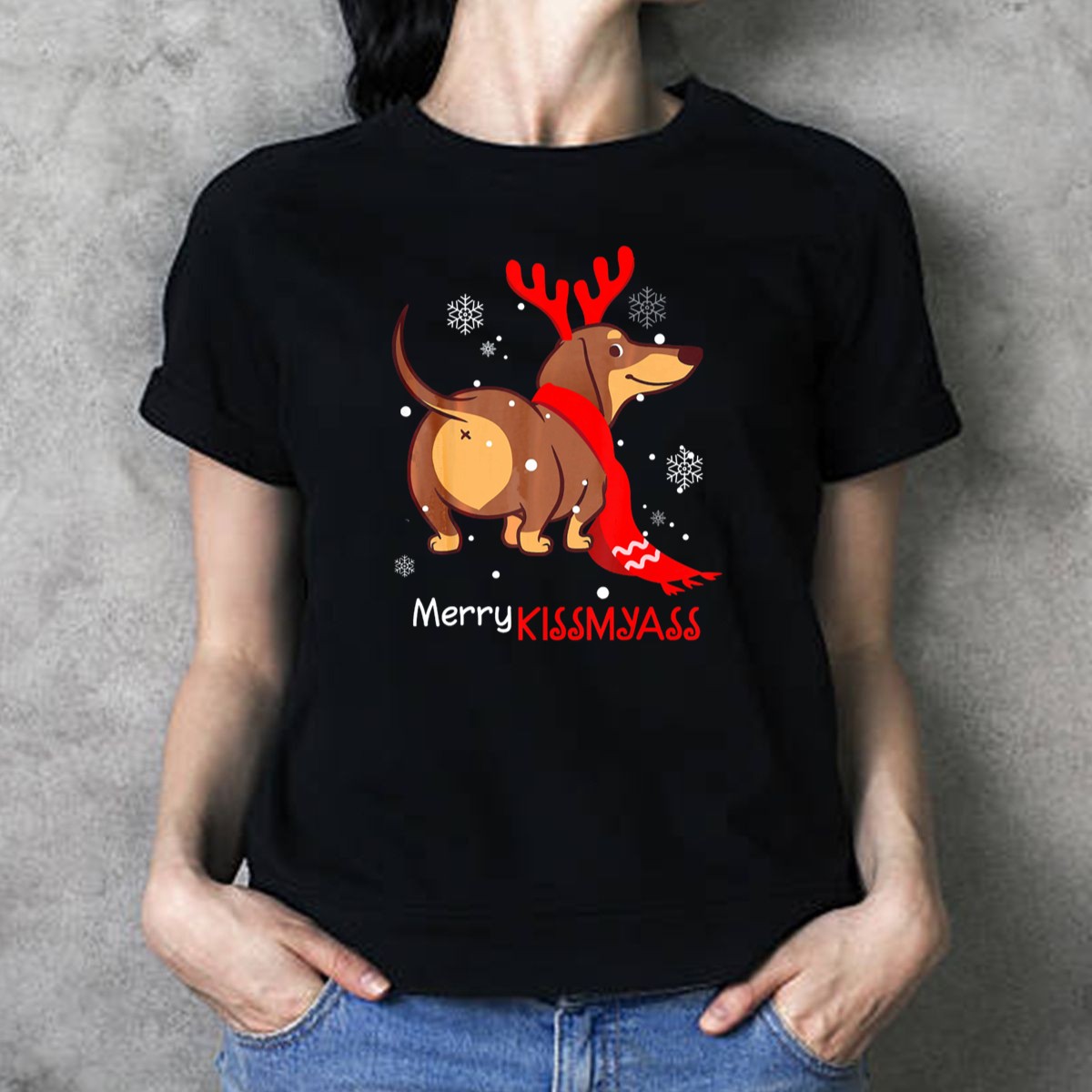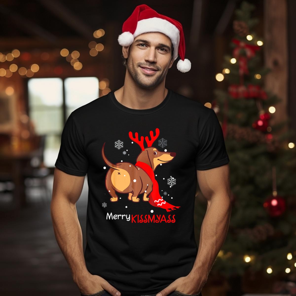 Celebrate the holiday season with a touch of humor in our Funny Dog Dachshund Christmas Merry Kiss My Ass T-Shirt! Perfect for dog lovers and anyone who appreciates a good laugh, this shirt is ideal for casual outings, holiday parties, or just lounging at home. The unique fan-made design showcases a playful dachshund and is proudly printed in the USA, making it a delightful addition to your festive wardrobe.