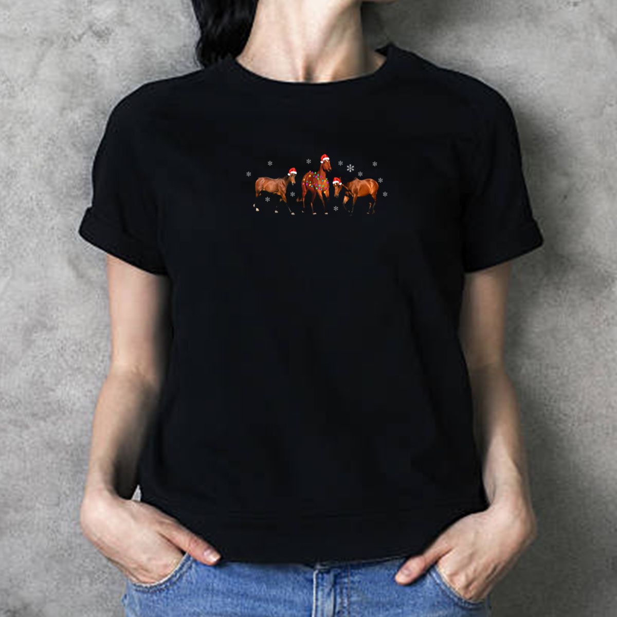 Embrace the festive spirit with our Funny Horse Christmas Lights Santa Hats Snowflakes T-Shirt, perfect for equestrian enthusiasts and holiday lovers alike! This playful design adds a touch of humor to your holiday gatherings, making it an ideal choice for casual wear, themed events, or just a cozy day at home. Crafted with care in the USA, this shirt combines comfort and fun, ensuring you stand out in any festive crowd.