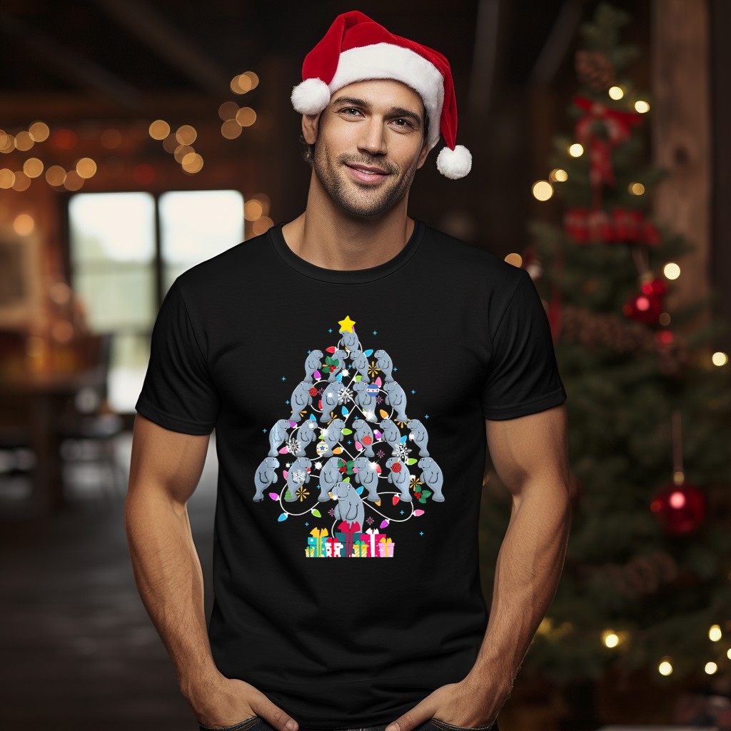 Funny Manatee Christmas Tree With Santa Hats And T-Shirt