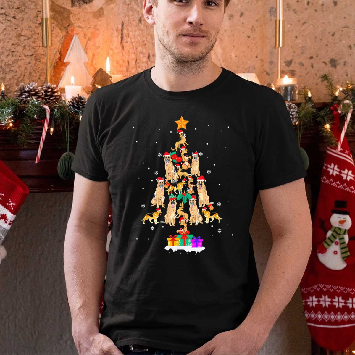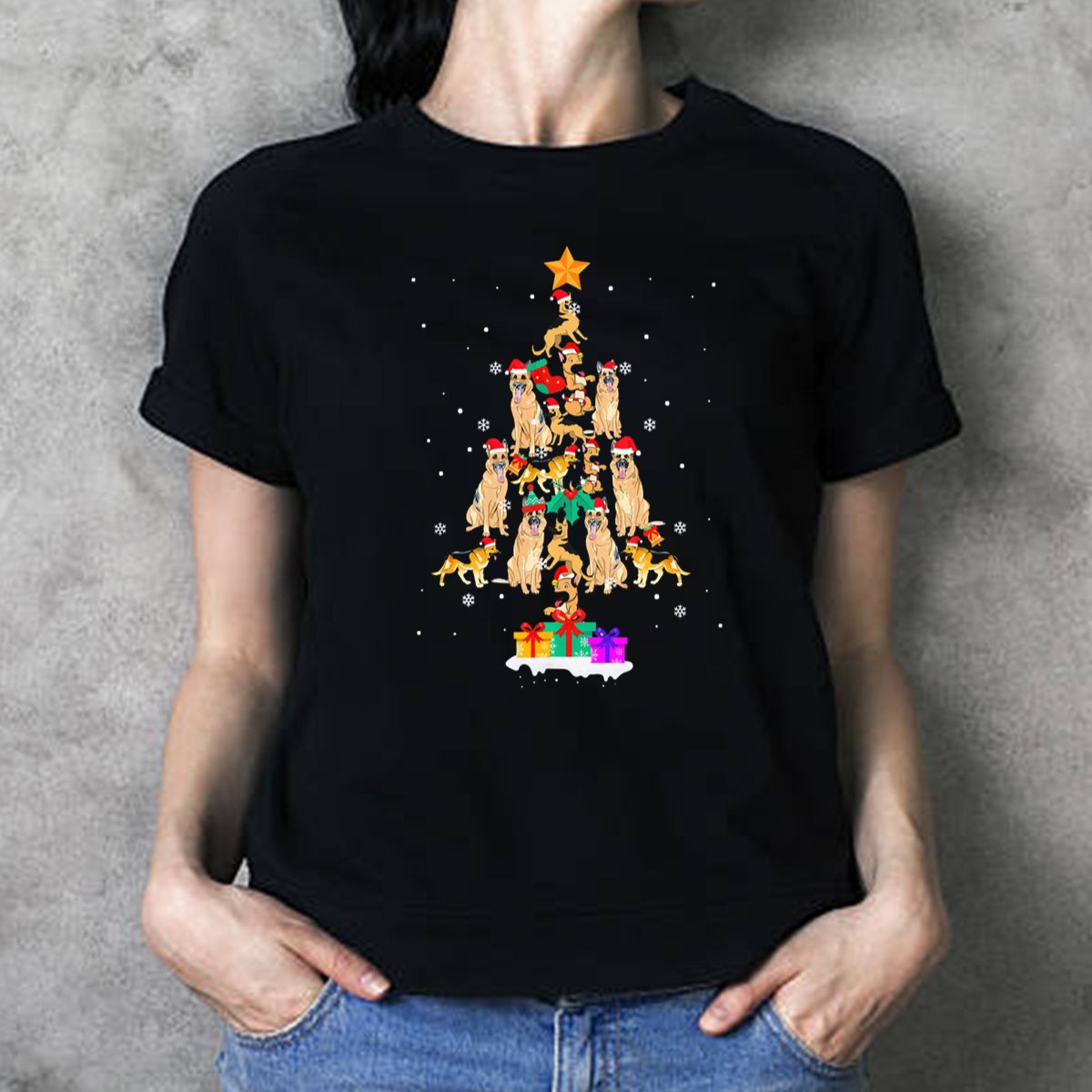 Celebrate the holiday season with our German Shepherd Christmas Tree T-shirt, perfect for dog lovers and festive gatherings! This fan-made design features an adorable Christmas tree adorned with Santa hats, ornaments, and gifts, making it an ideal choice for casual wear, themed events, or daily outings during the festive season. Printed in the USA, this shirt not only showcases your love for German Shepherds but also adds a touch of holiday cheer to your wardrobe.
