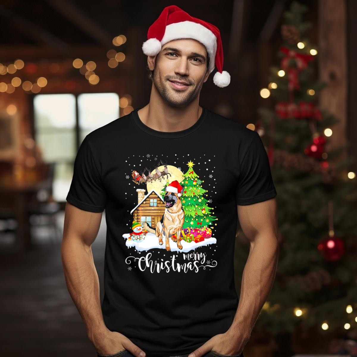Celebrate the holiday season with our charming German Shepherd Merry Christmas T-shirt! Perfect for dog lovers and festive gatherings, this shirt features an adorable graphic that showcases a German Shepherd in a Santa hat surrounded by a snowy cabin and Christmas tree. Made for those who want to spread cheer while staying comfortable, it’s an ideal choice for casual wear, themed events, or daily outings throughout the year. Printed in the USA, this fan-made design is sure to turn heads and bring smiles wherever you go!