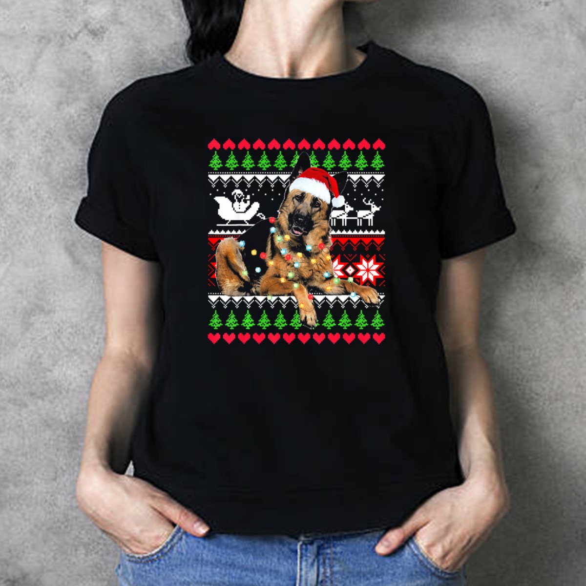 German Shepherd Santa Hat Christmas Lights Snowflake Ugly T-Shirt