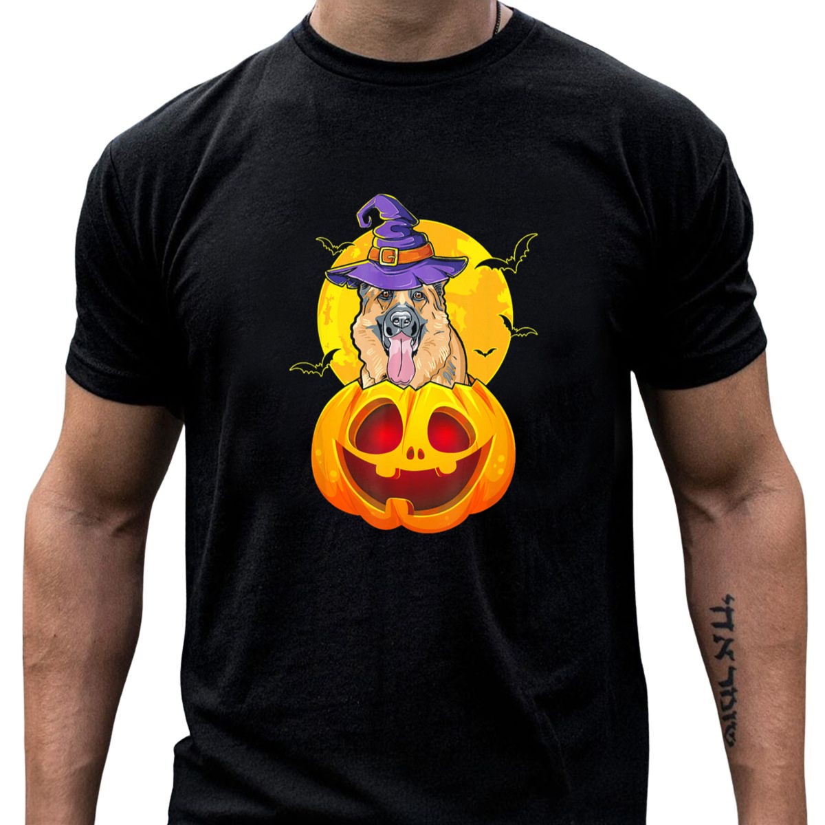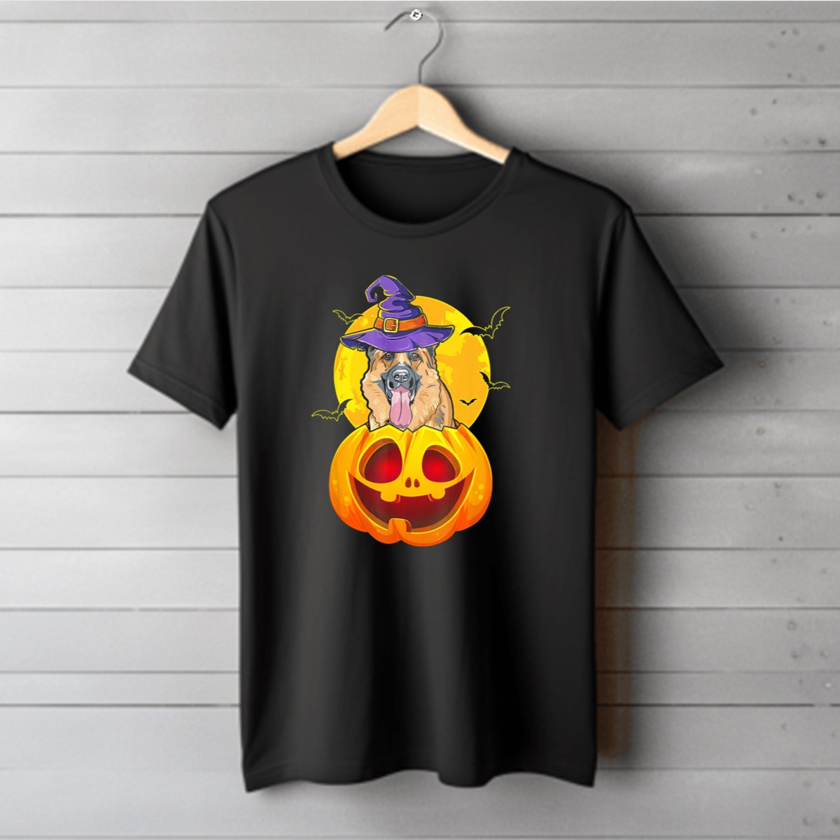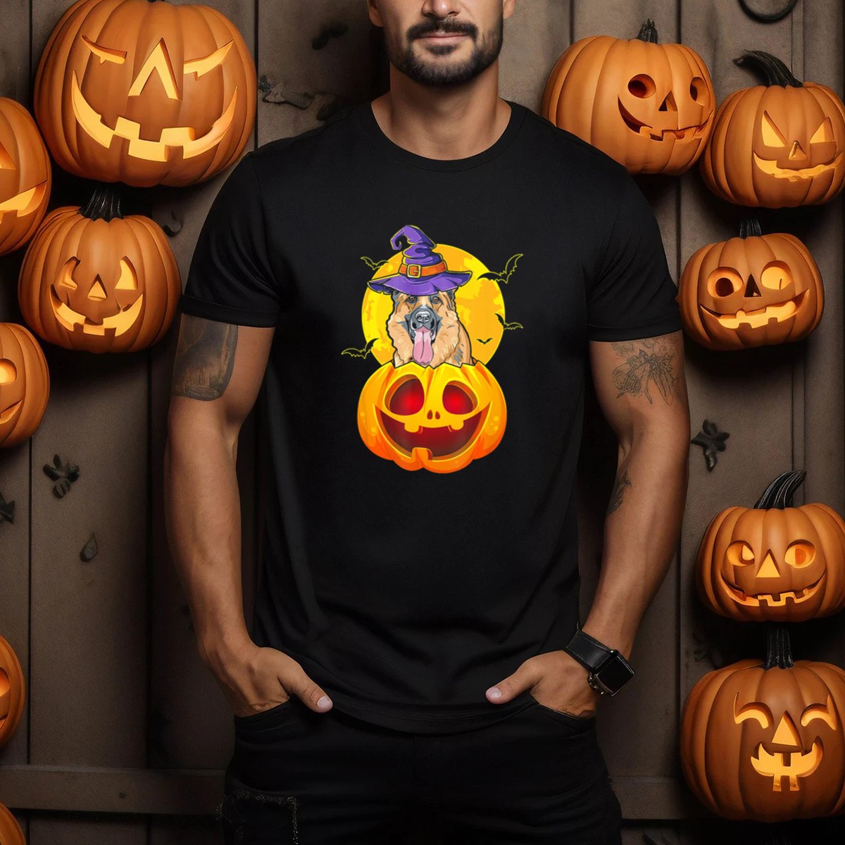 Embrace the spirit of Halloween with our German Shepherd Witch Hat Jack O Lantern T-Shirt, perfect for dog lovers and spooky season enthusiasts alike. This whimsical design features a charming German Shepherd adorned with a witch hat, surrounded by playful bats and a glowing jack-o-lantern against a moonlit backdrop. Ideal for casual outings, themed events, or just lounging at home, this shirt is a delightful way to showcase your love for both pups and Halloween festivities!