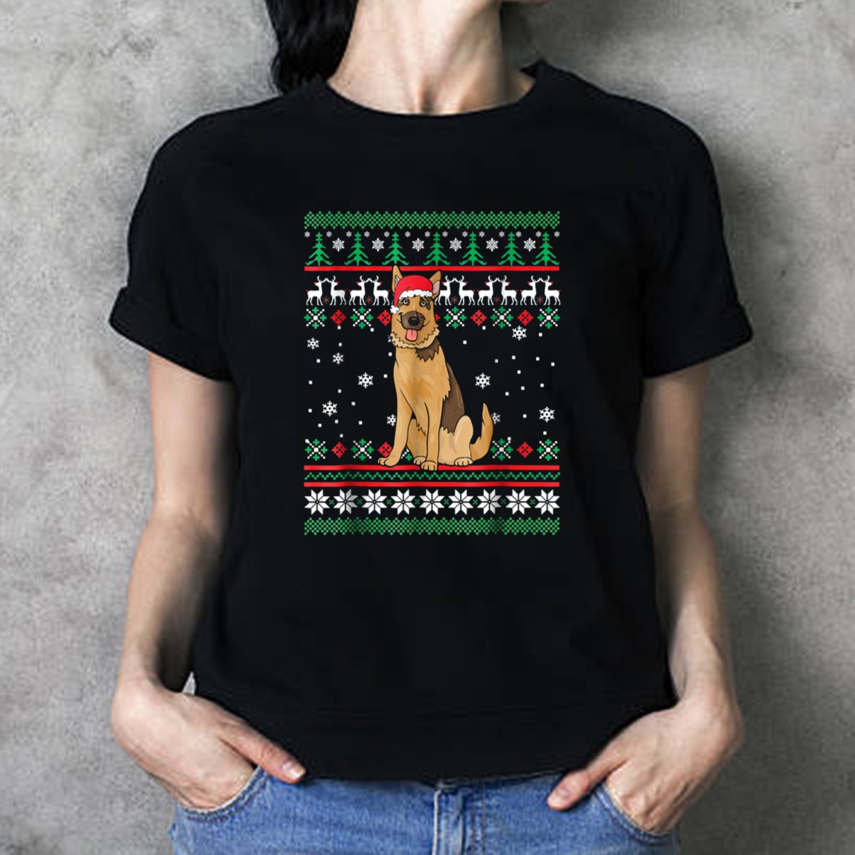 German Shepherd With Santa Hat Ugly Christmas Sweater Holiday Reindeer Snowflake T-Shirt
