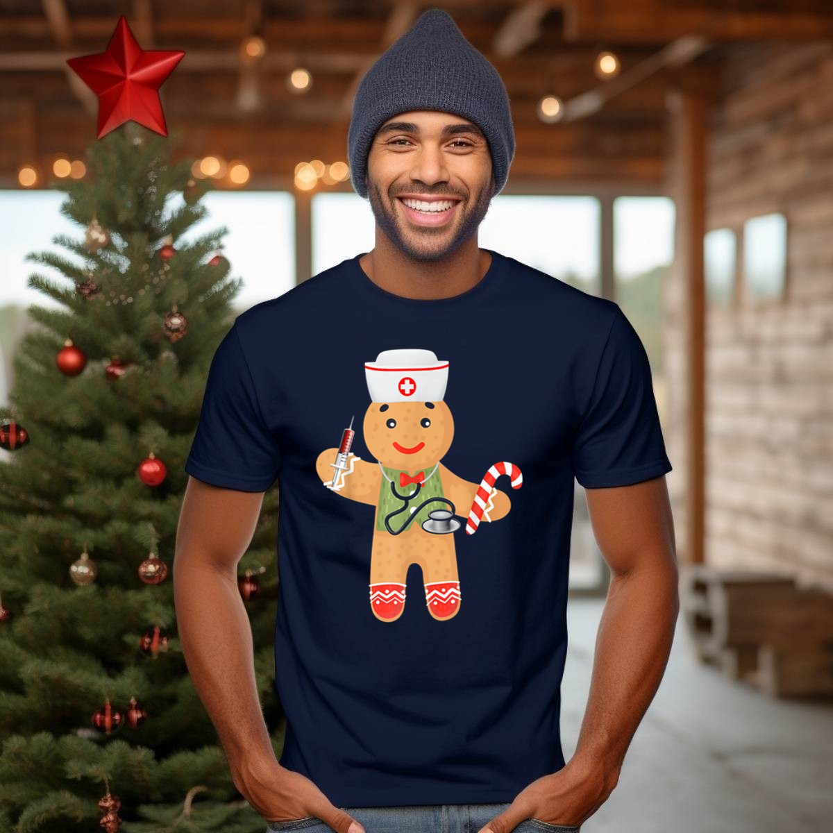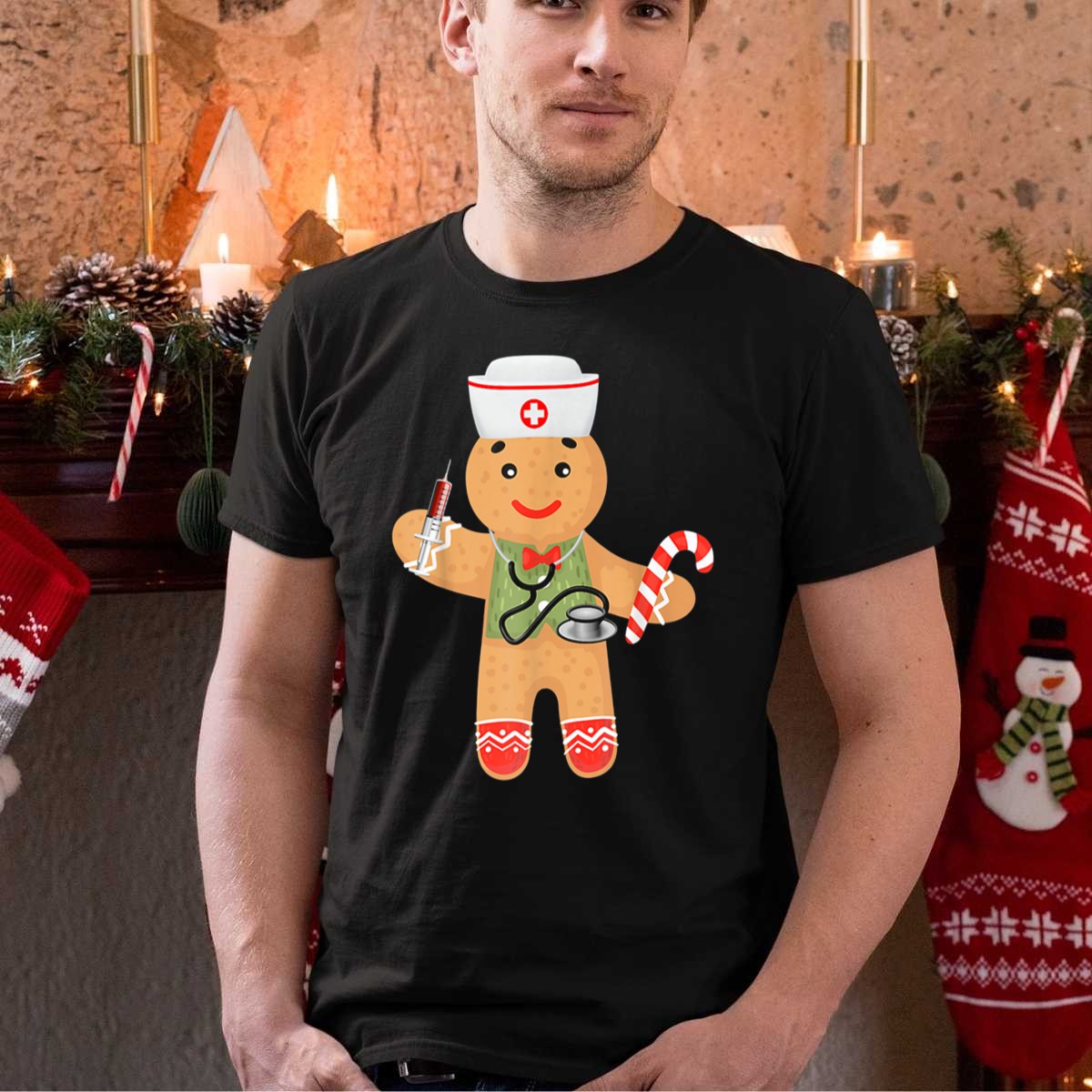 Be the first to review “Gingerbread Nurse Holding Syringe Stethoscope Candy Cane Christmas T-Shirt”