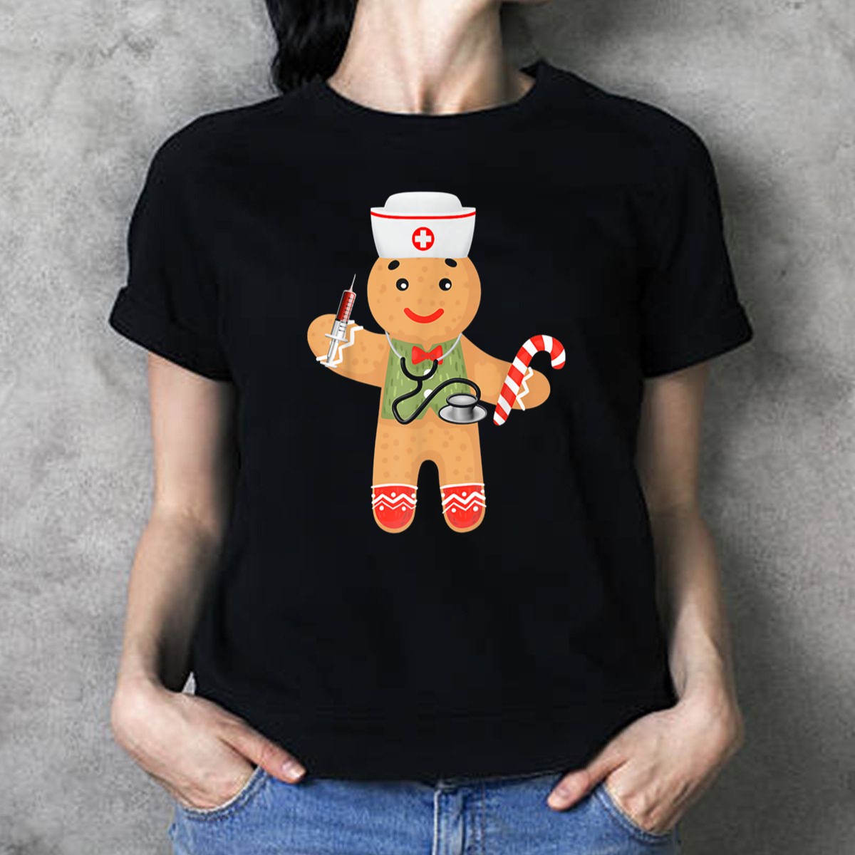 Gingerbread Nurse Holding Syringe Stethoscope Candy Cane Christmas T-Shirt