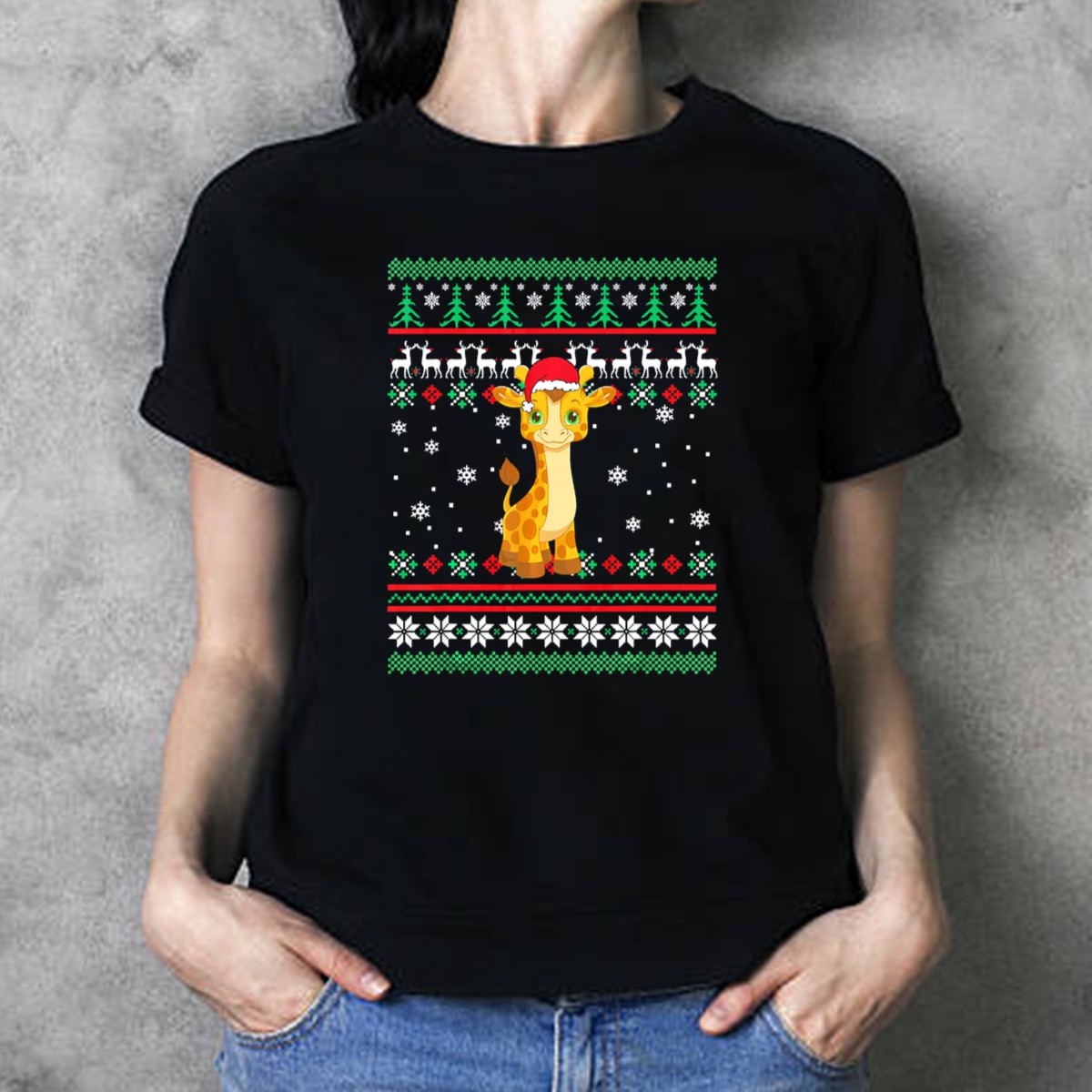Giraffe Santa Hat Christmas Reindeer Snowflakes Trees T-Shirt