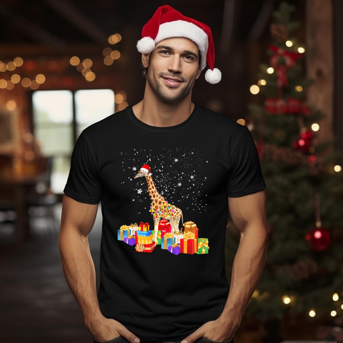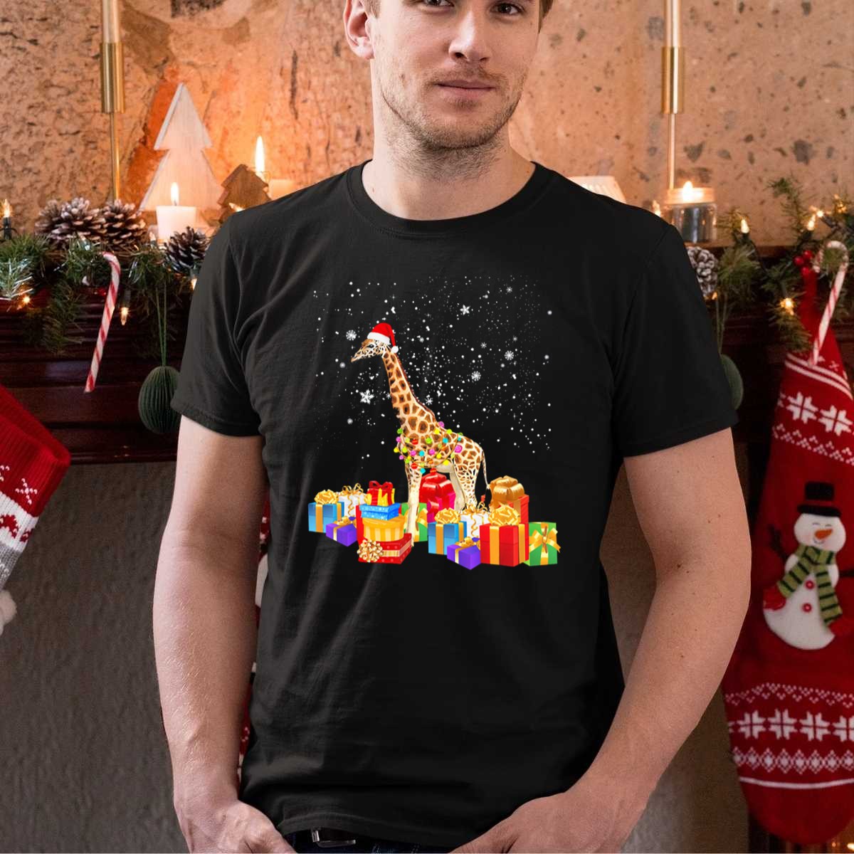 Be the first to review “Giraffe With Santa Hat Wrapped In Christmas Lights And Surrounded By Presents T Shirt”
